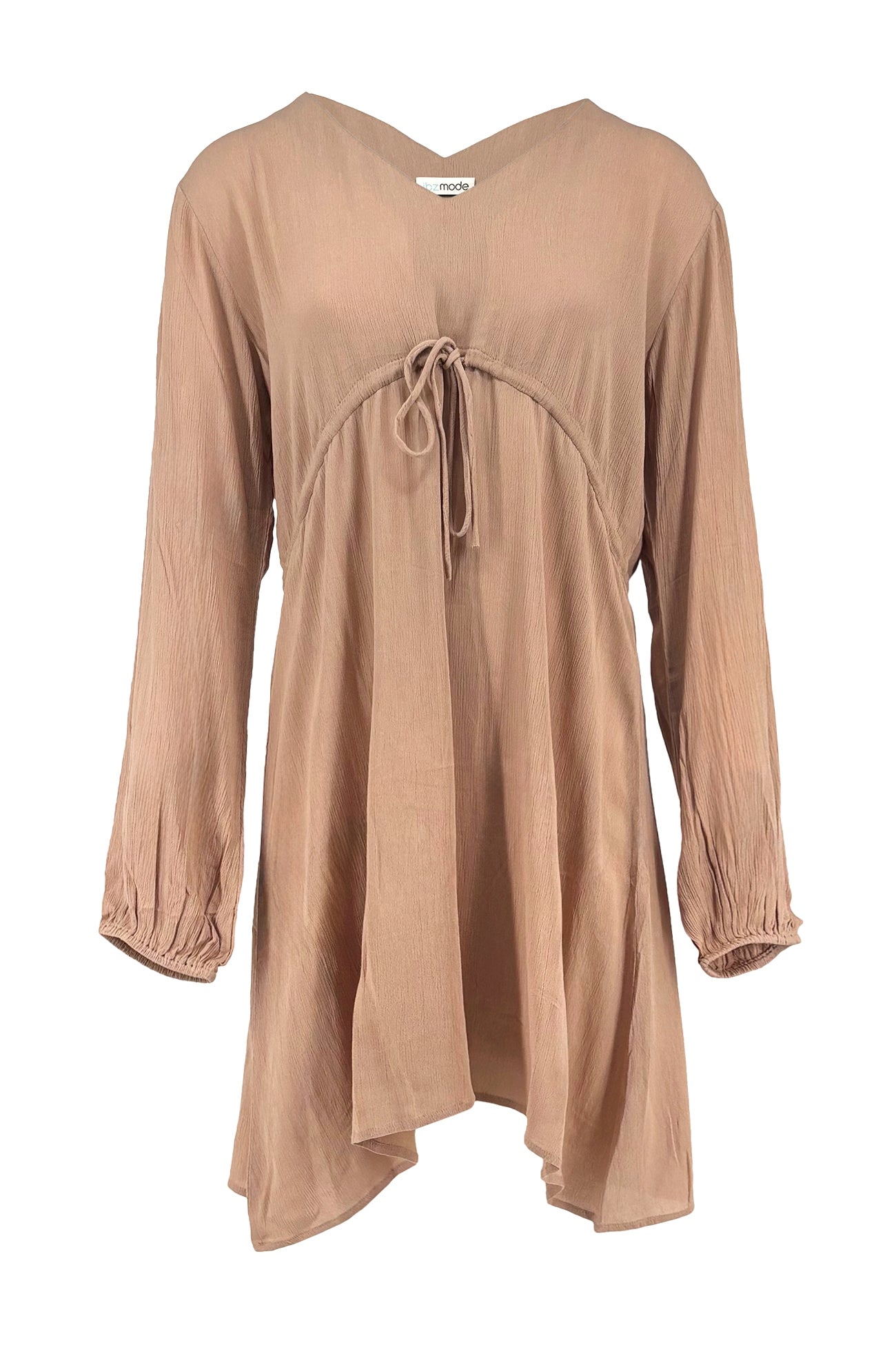 Product gegevens: Beautiful supple fall short dress with v-neck, elastic in the cuffs, and at the waist there is a drawstring all around that can be tightened or loosened as desired