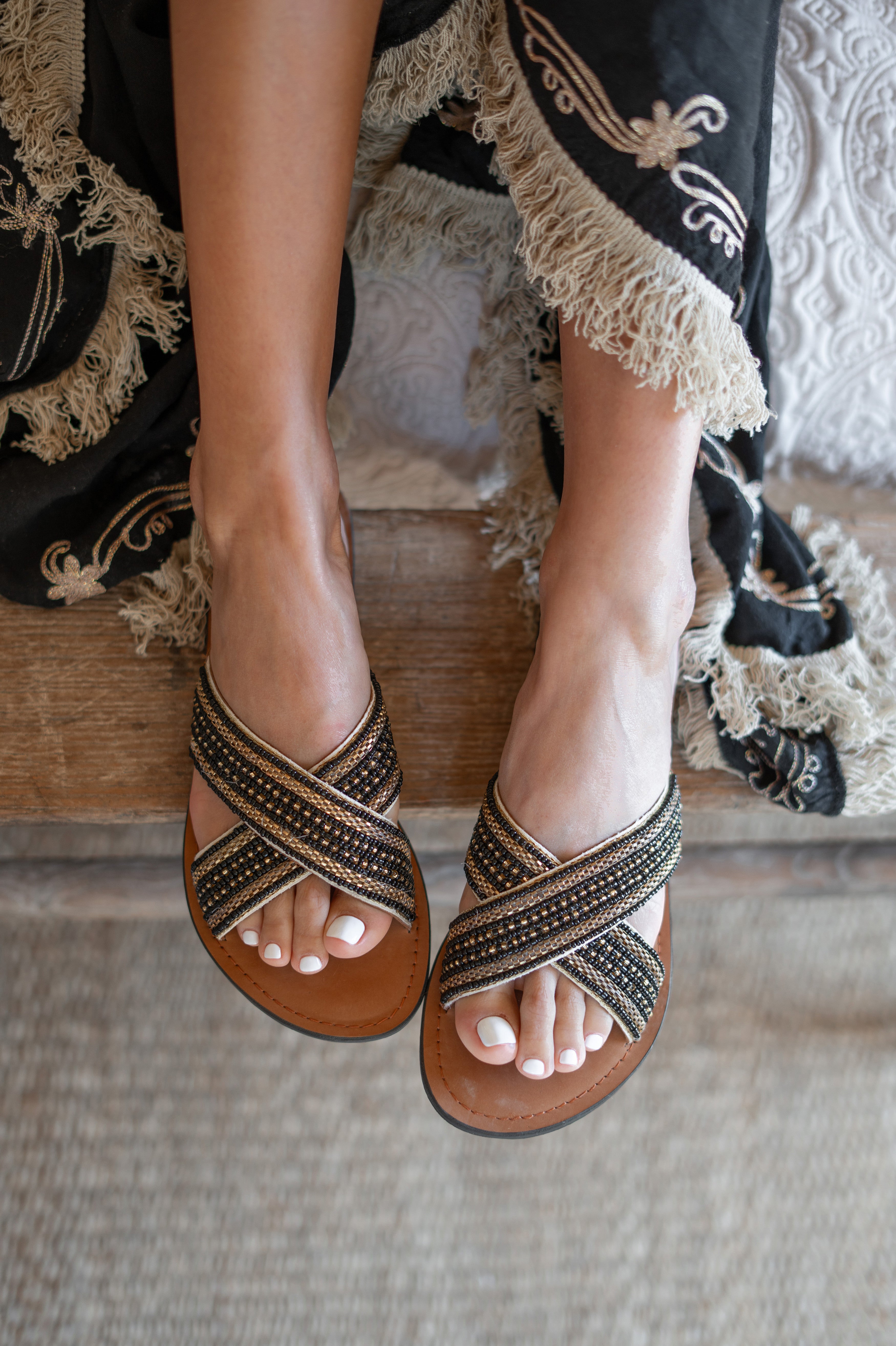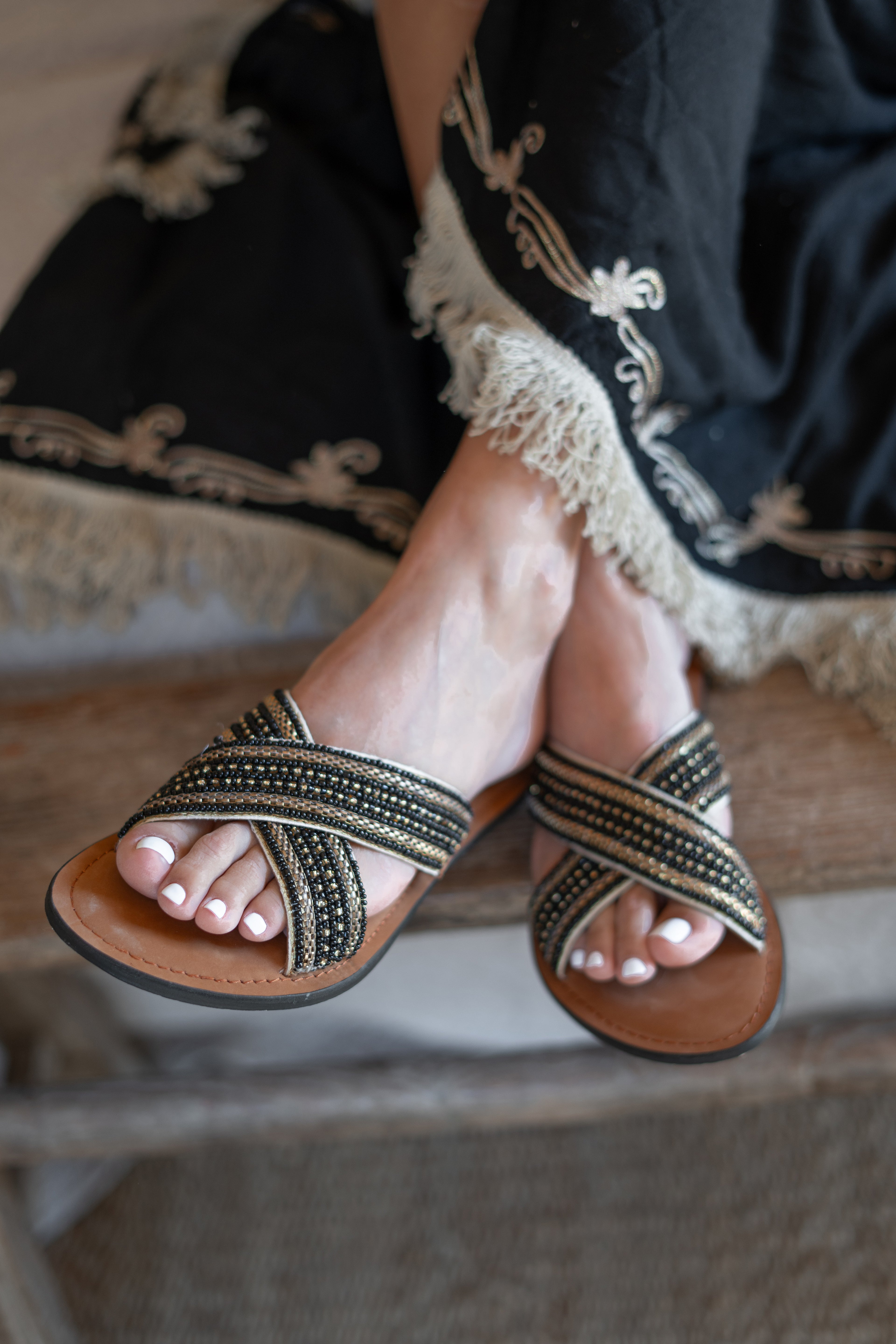 This Slipper Beads Black from ibzmode in black exudes Ibiza vibes. Has crossed wide straps, the straps are richly set with beads and decorative chains, has a Order fast and enjoy the bohemian lifestyle every day.