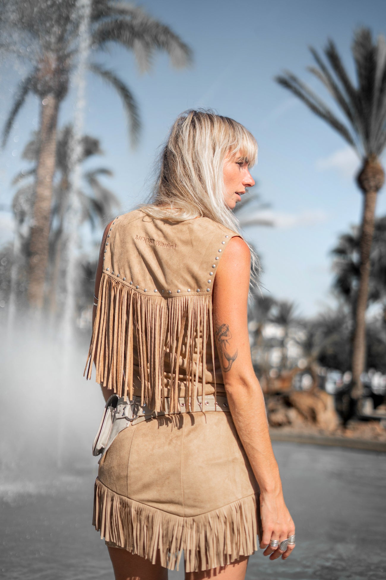 The Kriss Fringe Skirt Camel from MOOST is a real eye-catcher from the Sunset Boulevard collection from Motel Escape. This skirt exudes western attitude and feminine power in one powerful silhouette.