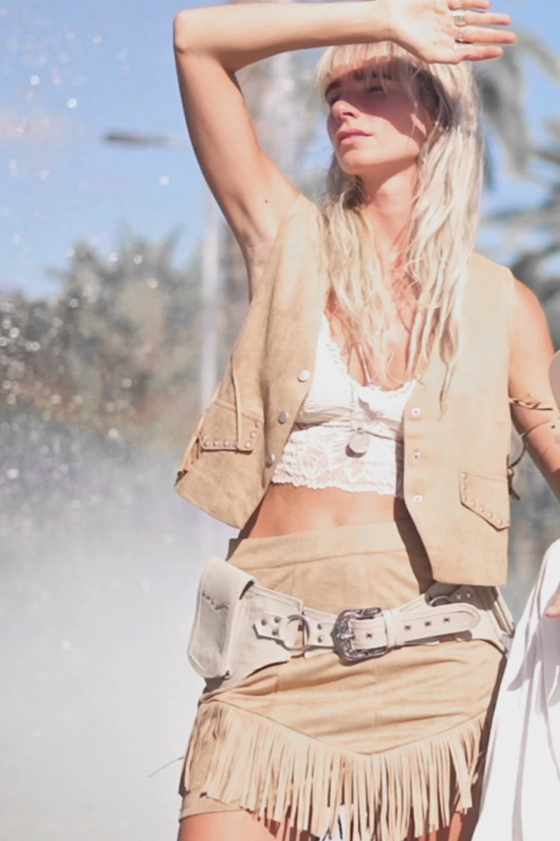 The camel color enhances the sun-kissed appearance and fits perfectly within the earthy tones of the collection. From festival to summer party, this skirt literally moves with you.