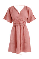 The Romy Short Dress dusty pink has a deep V neck with subtle braided details along the edge. The waist is slightly fitted and creates a beautiful silhouette. The short length gives the dress a playful balance. The sleeves are loose and comfortable.