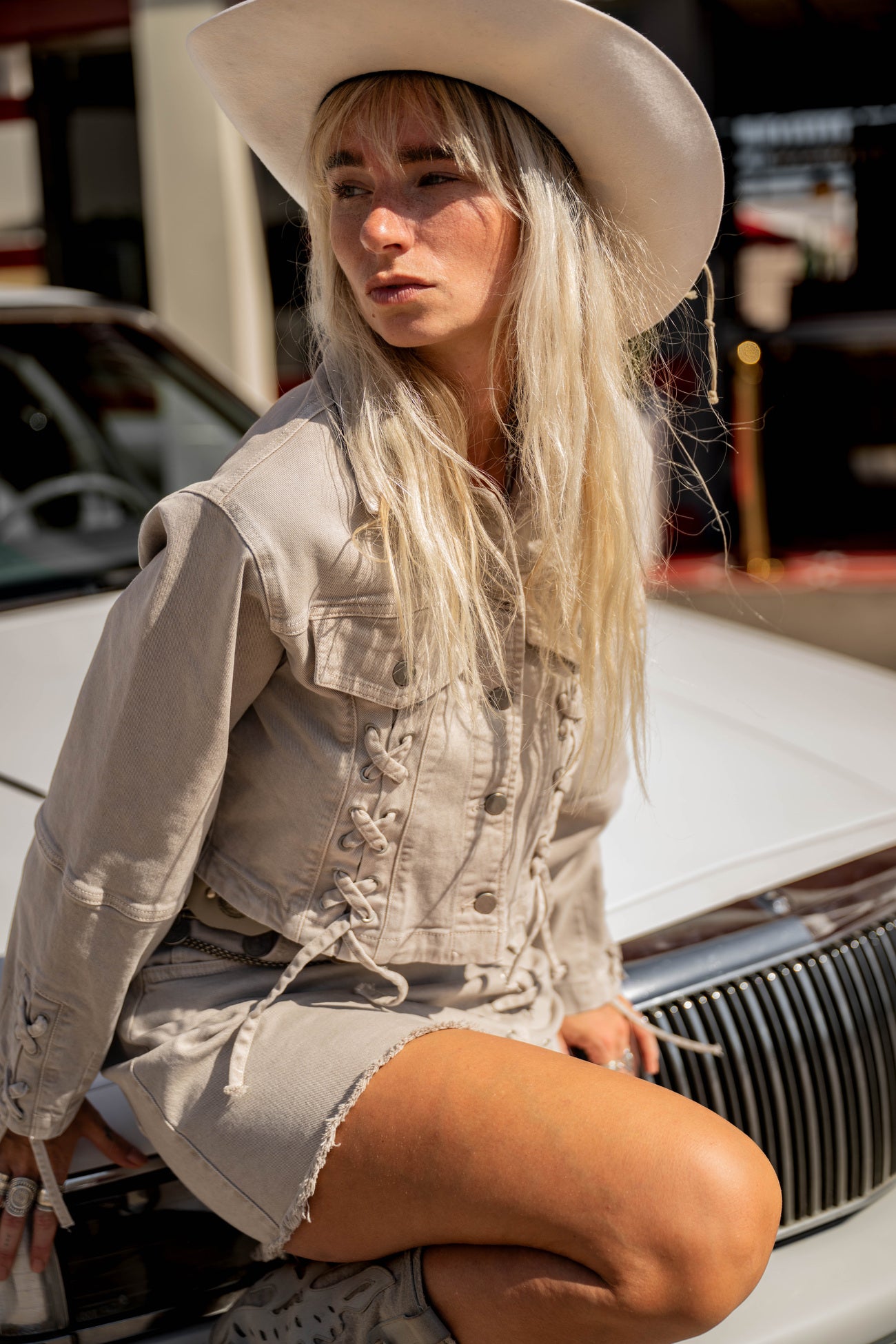 Furthermore, Alexa fits perfectly with the Destination Pink vibe. Tough denim combines effortlessly with soft tones, fresh white and dusty pink. Add a harness bag or western belt for extra edge. This will instantly make your outfit stronger and more pronounced.