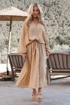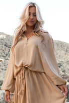 The Dress Solenya Taupe bohemian dress exudes tranquility and warmth within ibzmode's Golden Glow collection. The soft taupe hue forms a natural base that is easy to combine. Here it's all about silhouette and movement, without sparkle or shine.