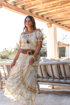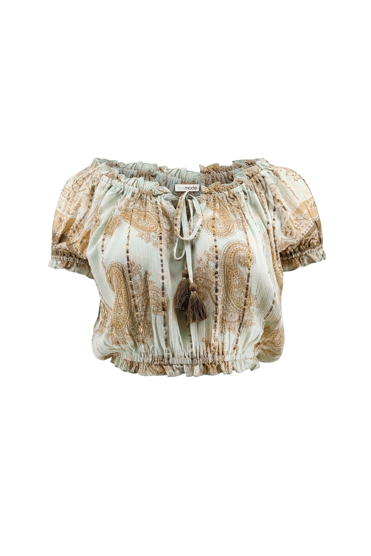 The Gypsy Solmira Light Mint paisley top combines freshness and warmth within ibzmode's Golden Glow collection. The paisley print is given added depth by a subtle sparkle that catches the light with every movement. The result is a soft sheen that looks natural.