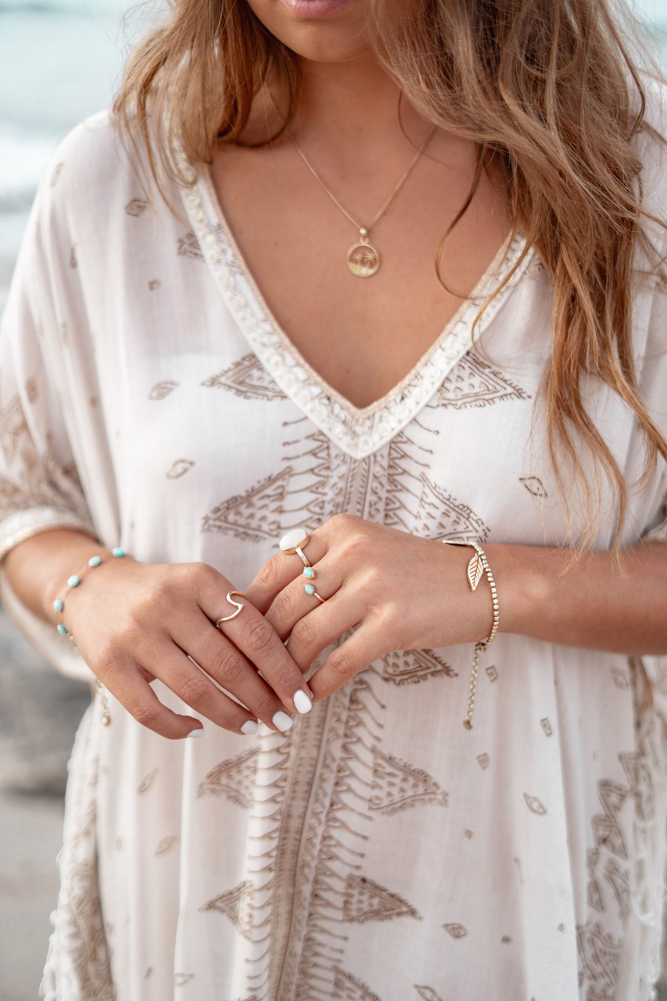 Esta joya tiene una base de latón macizo y está acabada con una capa de oro auténtico. La combinación crea un brillo cálido y un aspecto lujoso. Llévalo con cuidado -evita el agua, los perfumes y los detergentes- y tu joya conservará su belleza durante mucho tiempo.