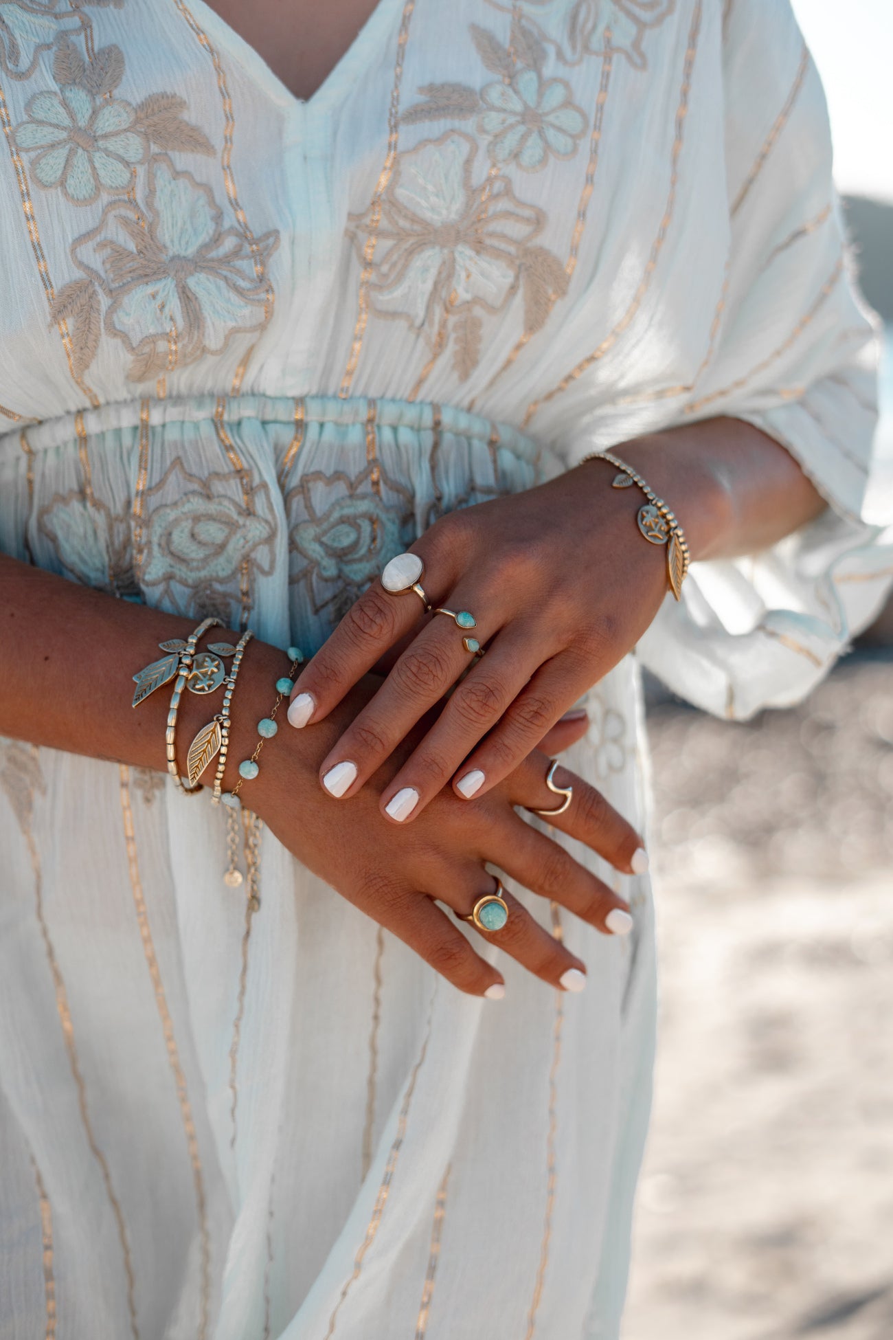 Esta joya tiene una base de latón macizo y está acabada con una capa de oro auténtico. La combinación crea un brillo cálido y un aspecto lujoso. Úsala con cuidado -evita el agua, los perfumes y los detergentes- y tu joya conservará su belleza durante mucho tiempo.