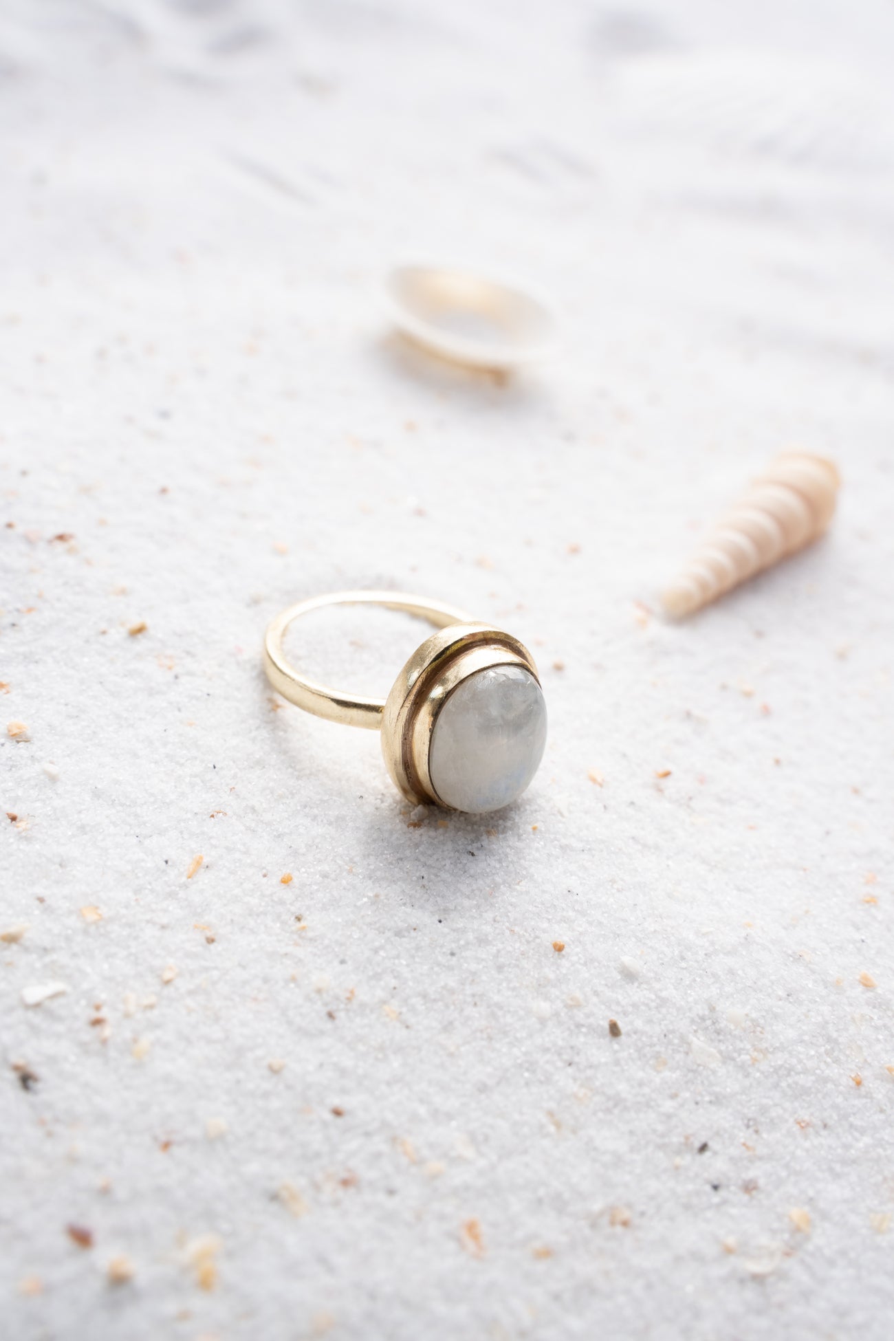 Product gegevens: Revestido de latón con oro auténtico (18K), el anillo lleva una auténtica piedra natural Piedra Lunar. Se entrega en un bonito estuche de regalo