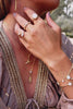 Esta joya tiene una base de latón macizo y está acabada con una capa de oro auténtico. La combinación crea un brillo cálido y un aspecto lujoso. Llévalo con cuidado -evita el agua, los perfumes y los detergentes- y tu joya conservará su belleza durante mucho tiempo.