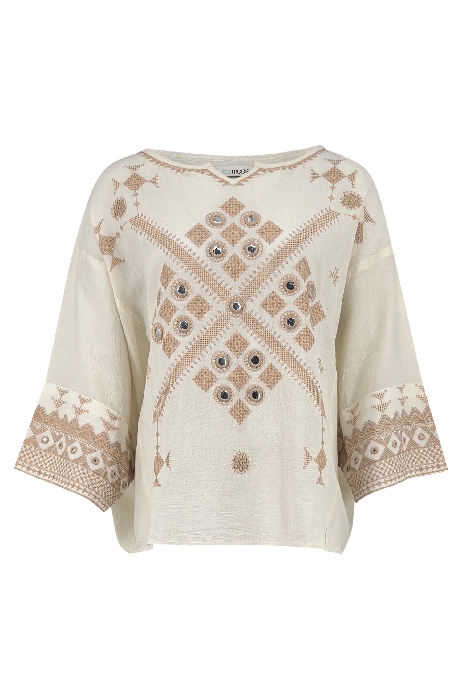 Daarnaast trekken de handgemaakte details meteen de aandacht. Rijk borduurwerk en fonkelende spiegeltjes vangen elk zonnestraaltje. Bij elke beweging glinstert de top subtiel mee. Zo ben je perfect gekleed voor de eerste lunch aan zee. Tegelijk blijft de fit relaxed en comfortabel, juist op warme dagen.