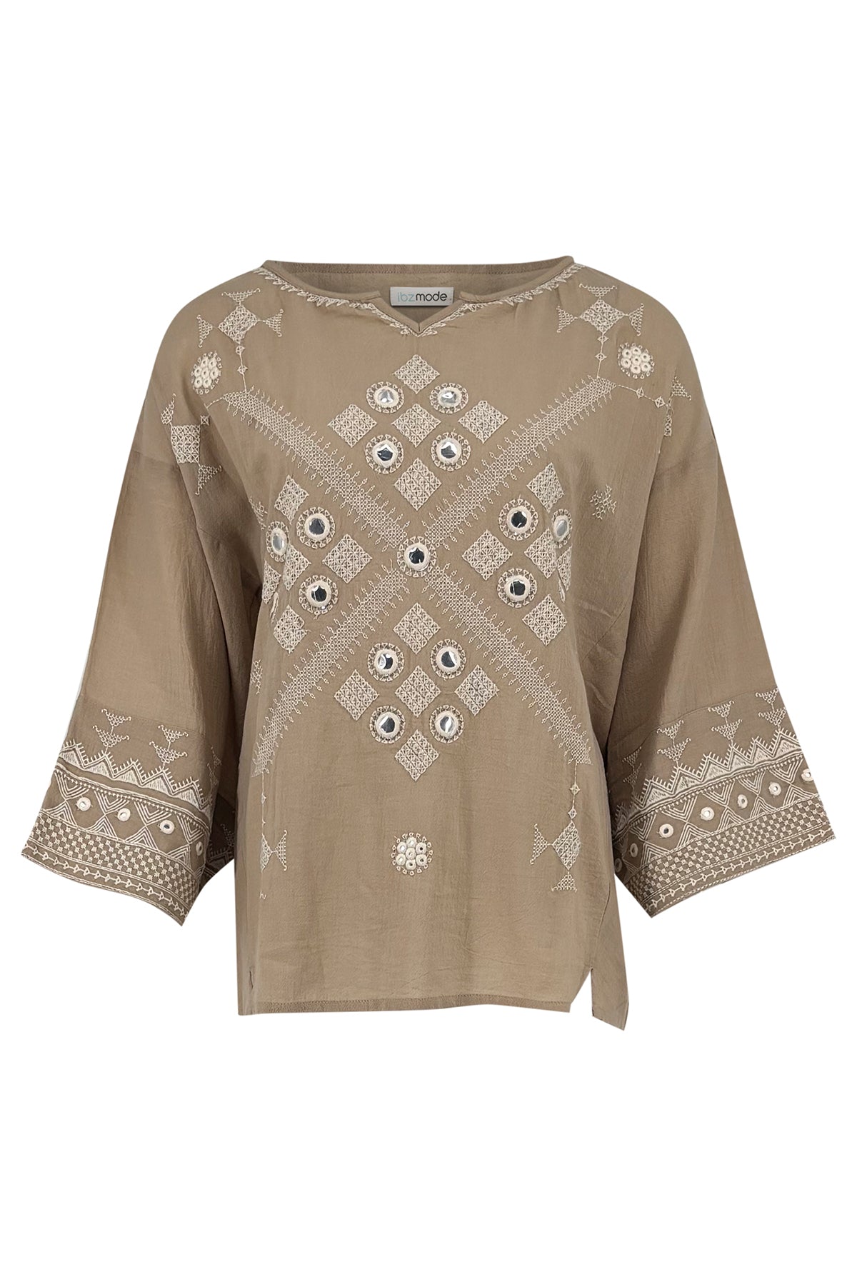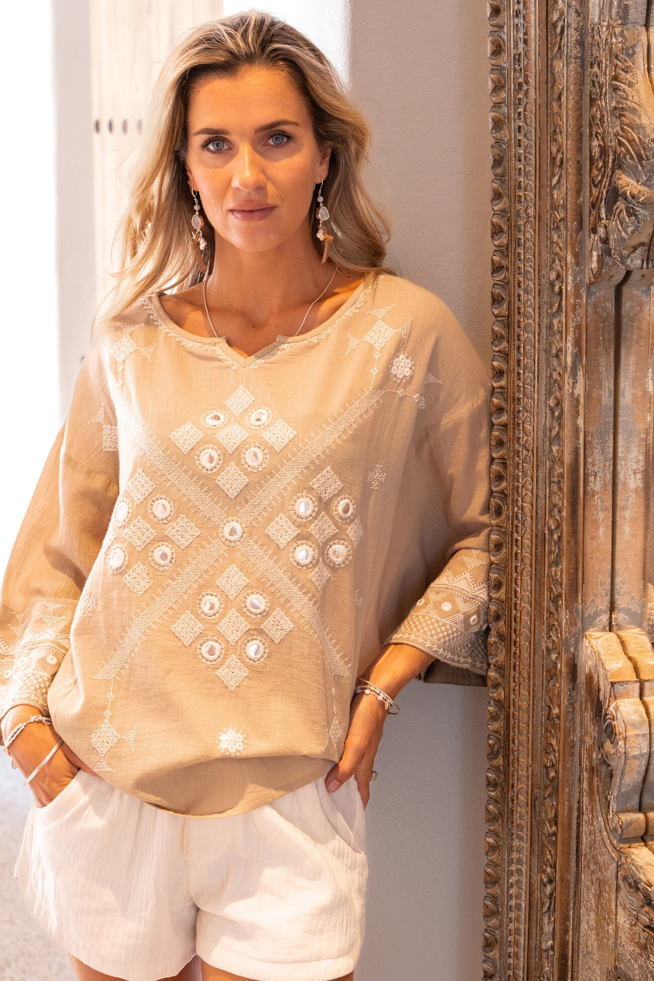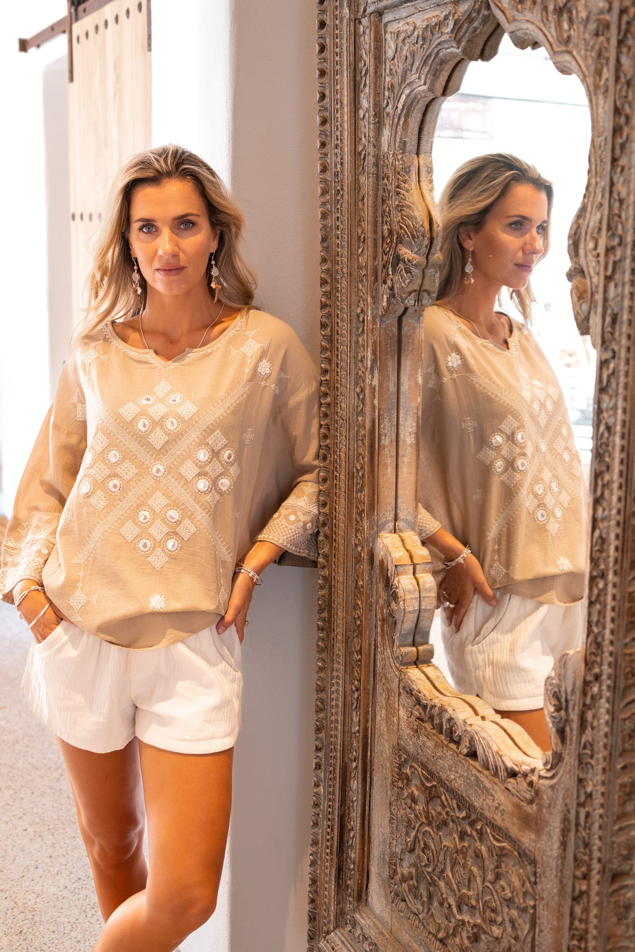 Ten eerste vallen de handgemaakte borduursels en fonkelende spiegeltjes direct op. Elk detail vangt het zonlicht en schittert zacht mee. Daardoor straalt Top Naluna Sundara Taupe aan de beachbar en tijdens lange lunches. De pasvorm is relaxed, met ruimte rond lijf en schouders. Zo blijft de top comfortabel, ook op warme dagen.