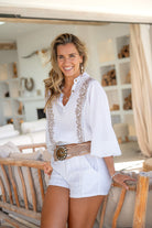 La blusa Briso Vedra pertenece a la colección Resort Escape de la moda ibicenca. Esta blusa está diseñada para los días soleados y las largas veladas. El tejido es suave, vaporoso y flexible sobre la piel. Como resultado, llevarás Briso Vedra cómodamente durante un día de playa, un paseo por la ciudad o unas vacaciones. El look es femenino, relajado y claramente boho.