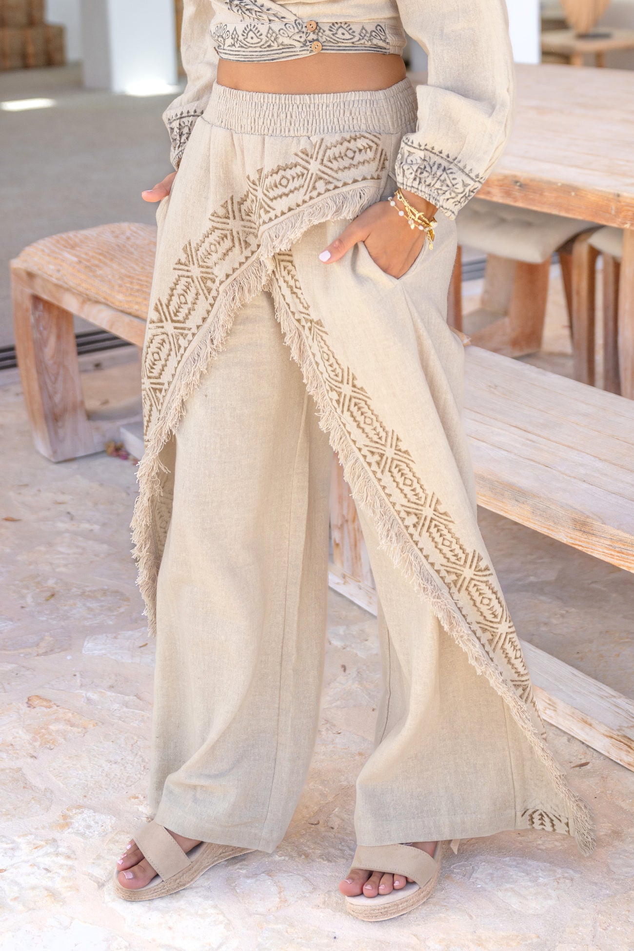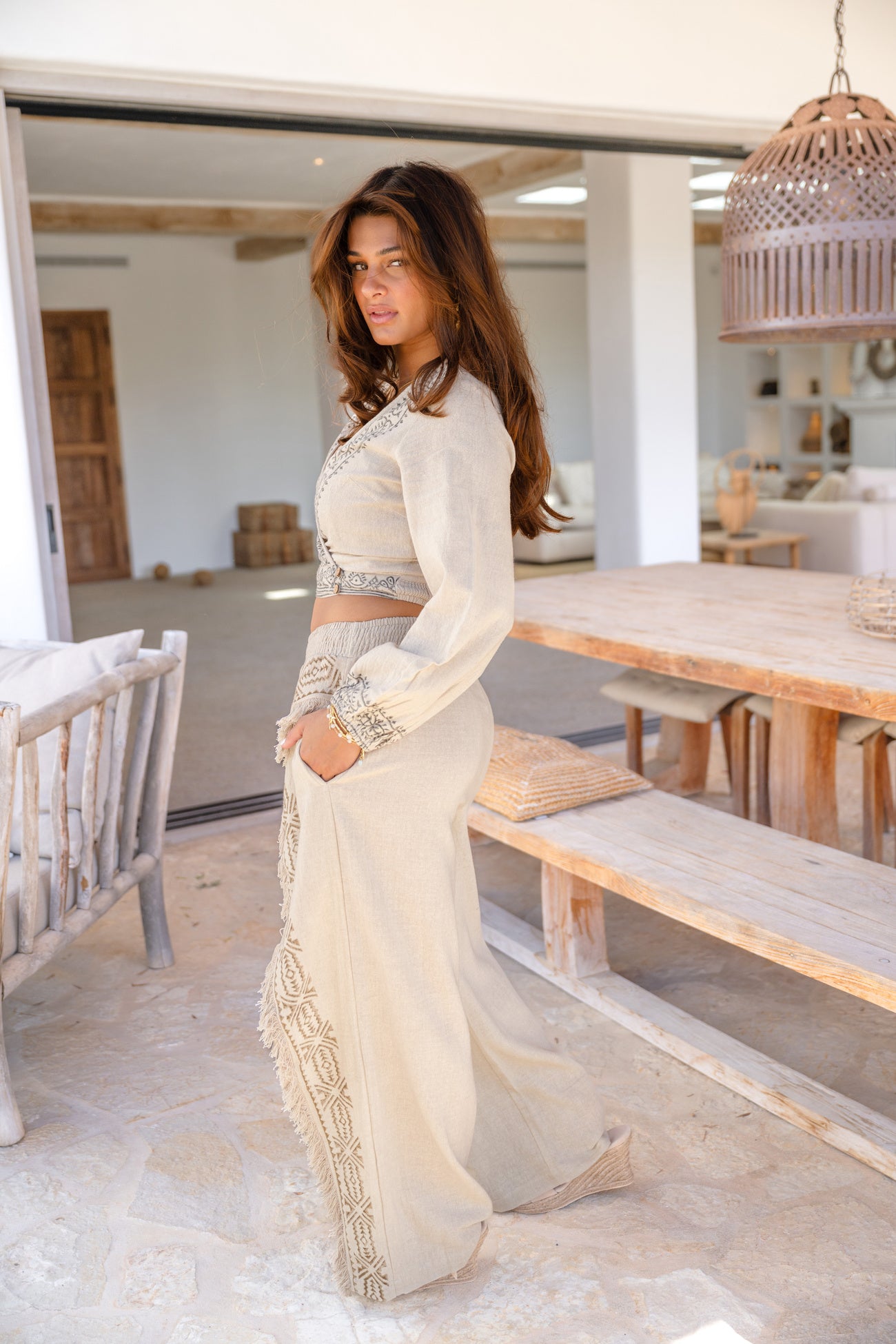 El pantalón Liraya Vedra forma parte de la colección Resort Escape de Ibiza fashion. Estos pantalones están hechos para los días soleados. El tejido es suave y transpirable sobre la piel. Como resultado, llevarás Liraya Vedra cómodamente cuando haga calor, de vacaciones o de viaje. El look es femenino, relajado y marcadamente boho.