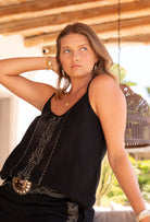 El top de tirantes Eden Vedra forma parte de la colección Resort Escape de Ibiza fashion. Este top está diseñado para los días soleados y las largas vacaciones. El tejido se siente suave y vaporoso sobre tu piel. Como resultado, llevarás Eden Vedra cómodamente con calor, en la playa o en la ciudad. El look es femenino, relajado y marcadamente boho.