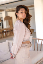 A continuación, peina tu Top Envolvente Adri Vedra muy fácilmente. Durante el día, ponte el top sobre pantalones cortos o de lino. Añade sandalias y un bolso de mimbre para un conjunto completo de vacaciones. Luego cambia a una falda larga y alpargatas. Esto creará un look de cena con aire de resort en un santiamén.