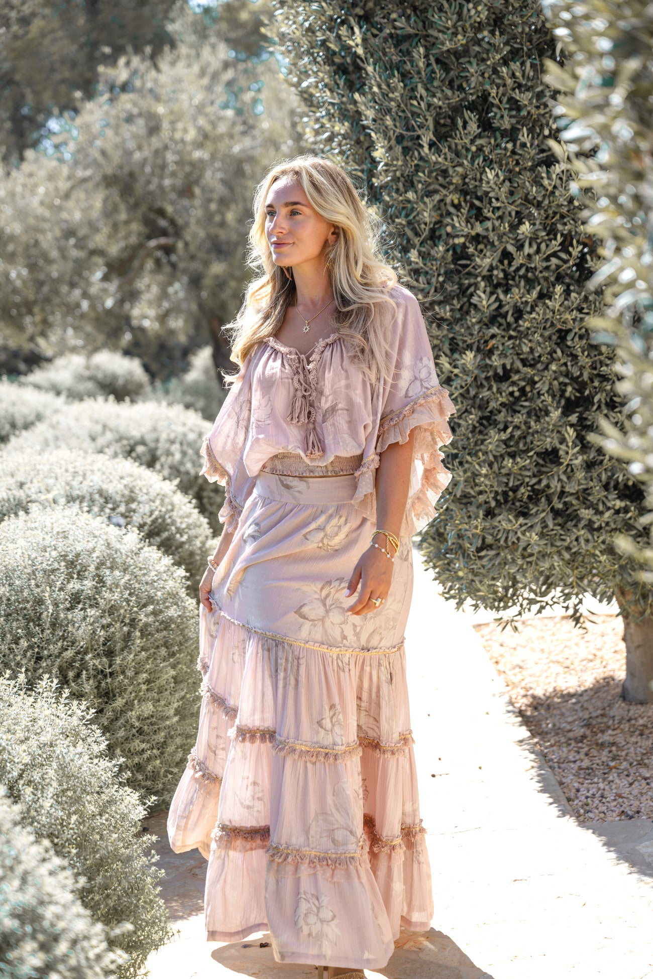 De lichtgewicht stof voelt comfortabel aan en beweegt soepel mee. De elastische tailleband zorgt ervoor dat de dames rok prettig zit gedurende de dag. Kanten details en subtiele afwerkingen geven de rok een verfijnde boho chic uitstraling.