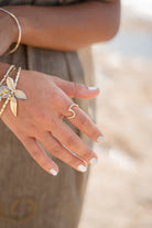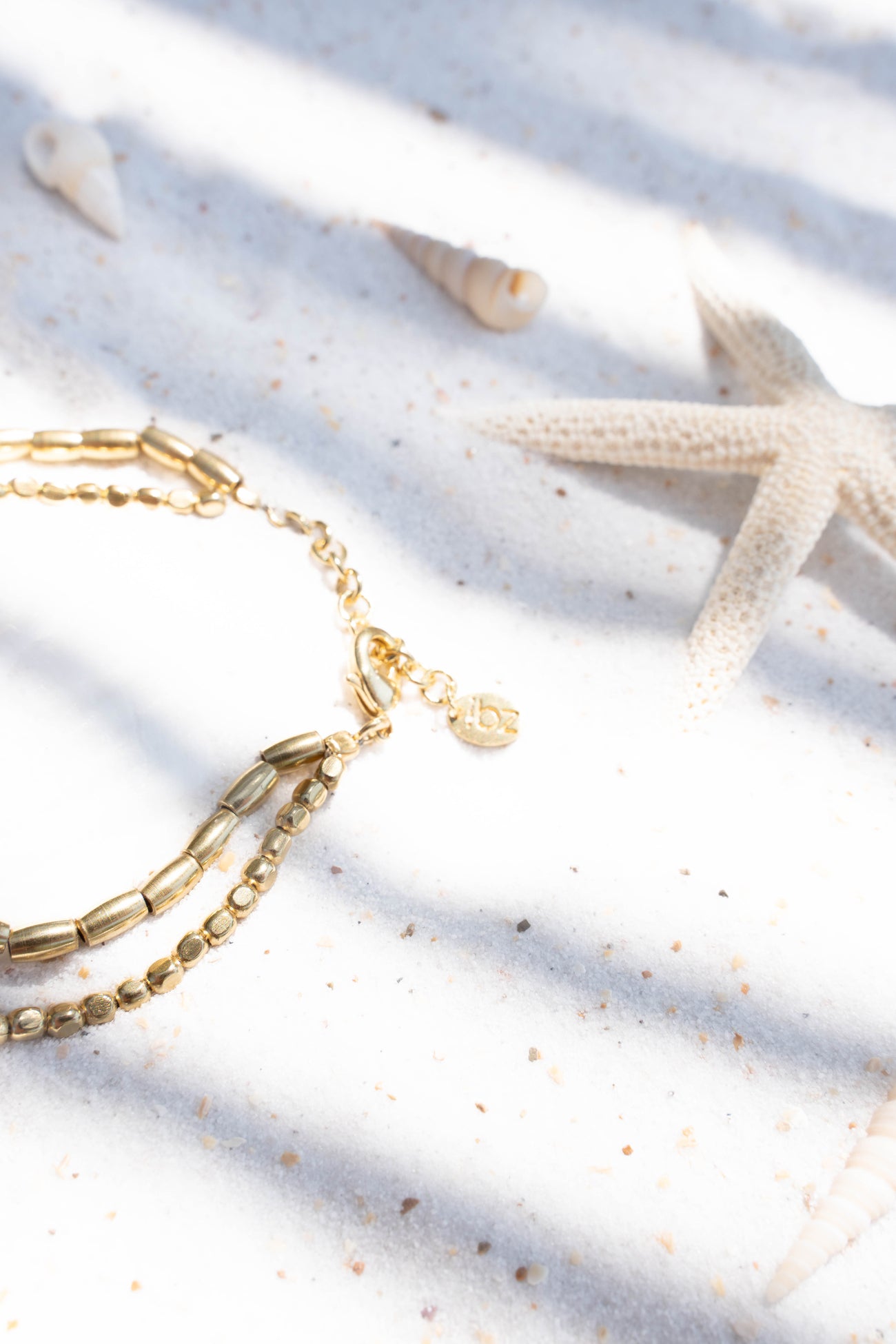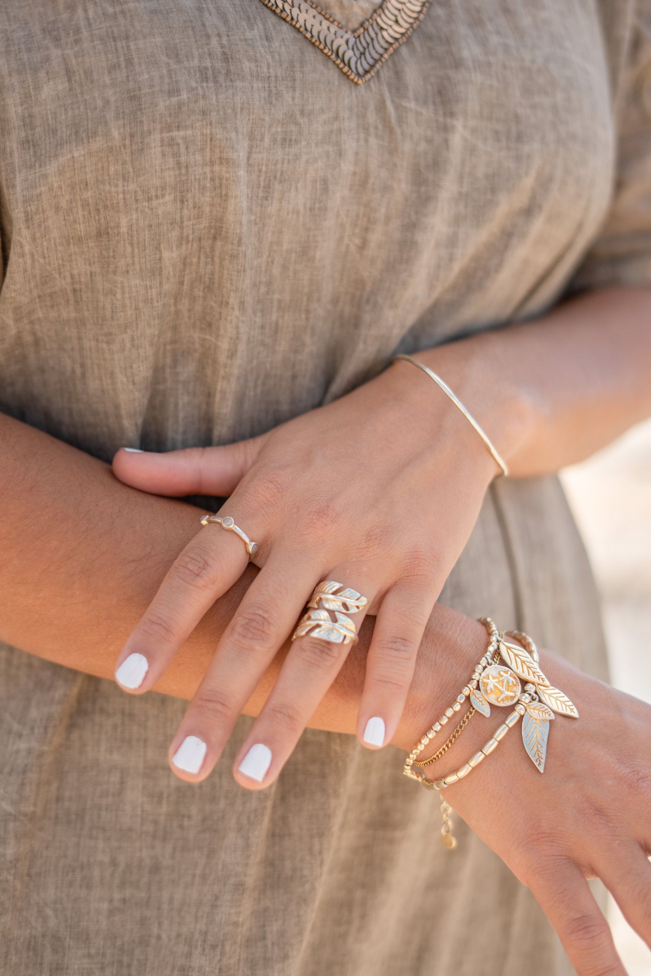 Esta joya tiene una base de latón macizo y está acabada con una capa de oro auténtico. La combinación crea un brillo cálido y un aspecto lujoso. Úsala con cuidado -evita el agua, los perfumes y los detergentes- y tu joya conservará su belleza durante mucho tiempo.