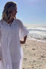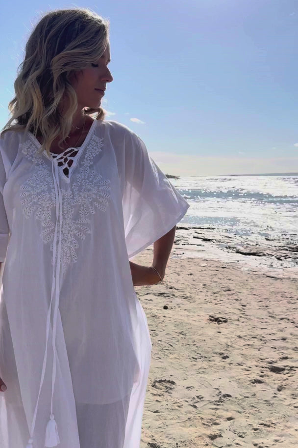 Crea tu look veraniego definitivo con el Kaftán Lia Flo Blanco en color blanco. Tiene escote en V, está confeccionado en un tejido vaporoso y de secado rápido, lleva bordados, el escote es de encaje Perfecto para combinar con chanclas, un top básico o una blusa ligera. Añade este imprescindible a tu armario de verano.