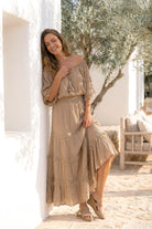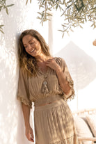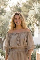 El Top Ana Taupe es un sofisticado top de mujer de la colección Bohemian Bloom. El suave tono topo forma una base tranquila, mientras que los detalles románticos como el encaje y los sutiles volantes crean un aspecto rico y femenino. Este top de mujer combina sin esfuerzo la comodidad con la elegancia boho chic.