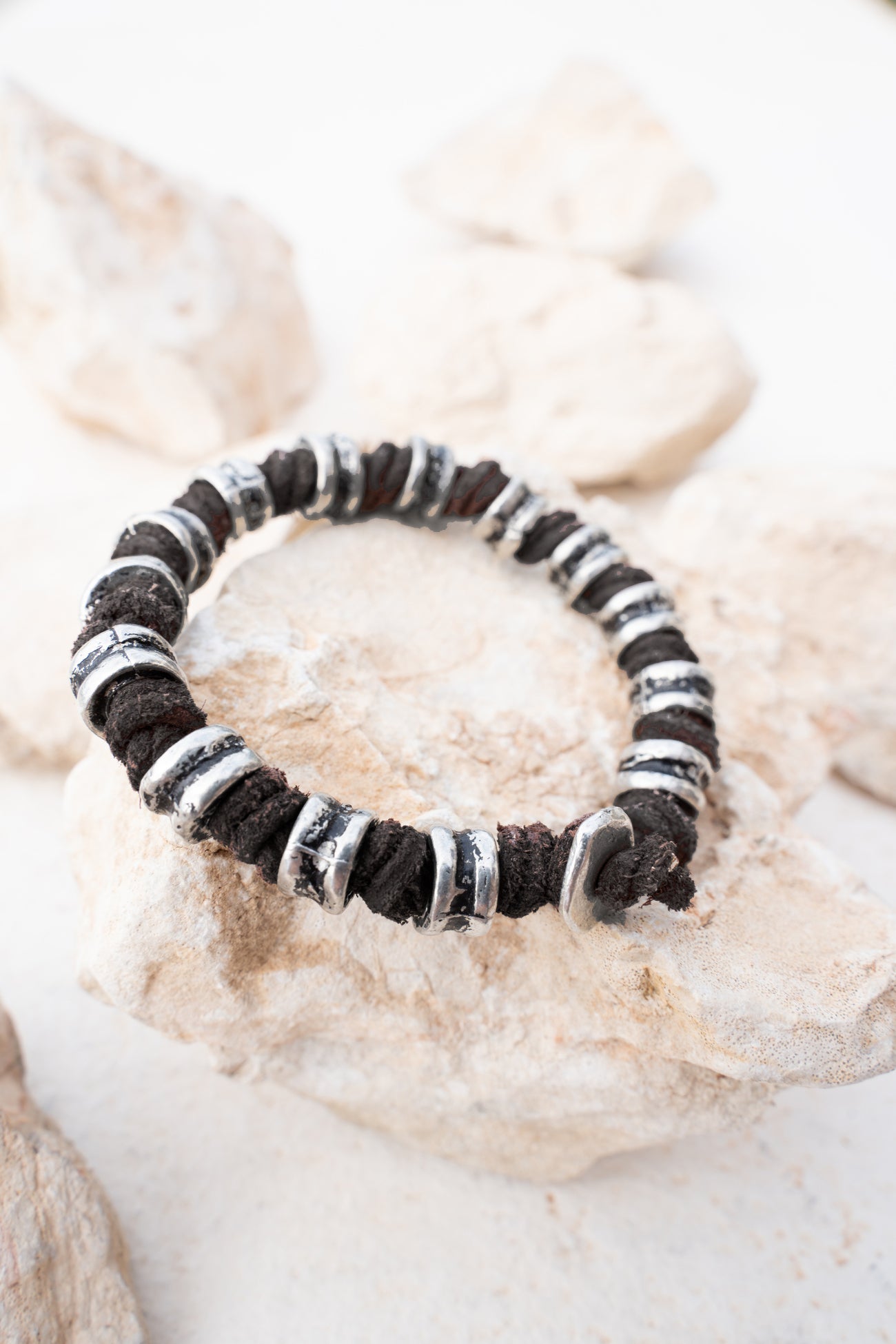 Product gegevens: Stoere armband gemaakt van Leer en Zink. Wordt geleverd in een mooie jute verpakking. Draag dit bij voorkeur niet in water of onder de douche!