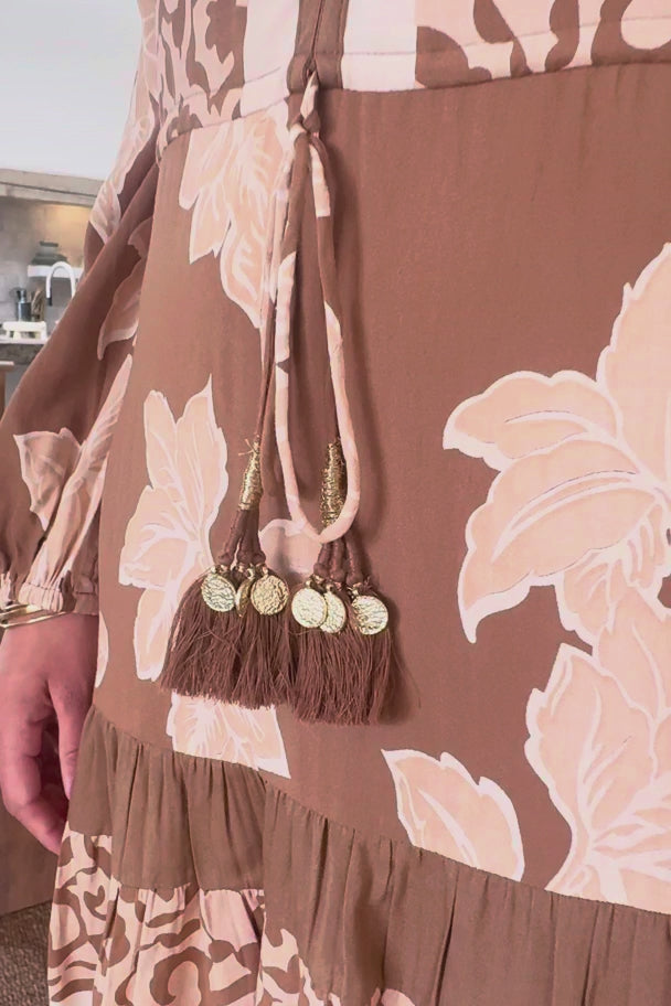 Product gegevens: Korte jurk met lange mouwen, v-hals en koord in de taille dat te verstellen is