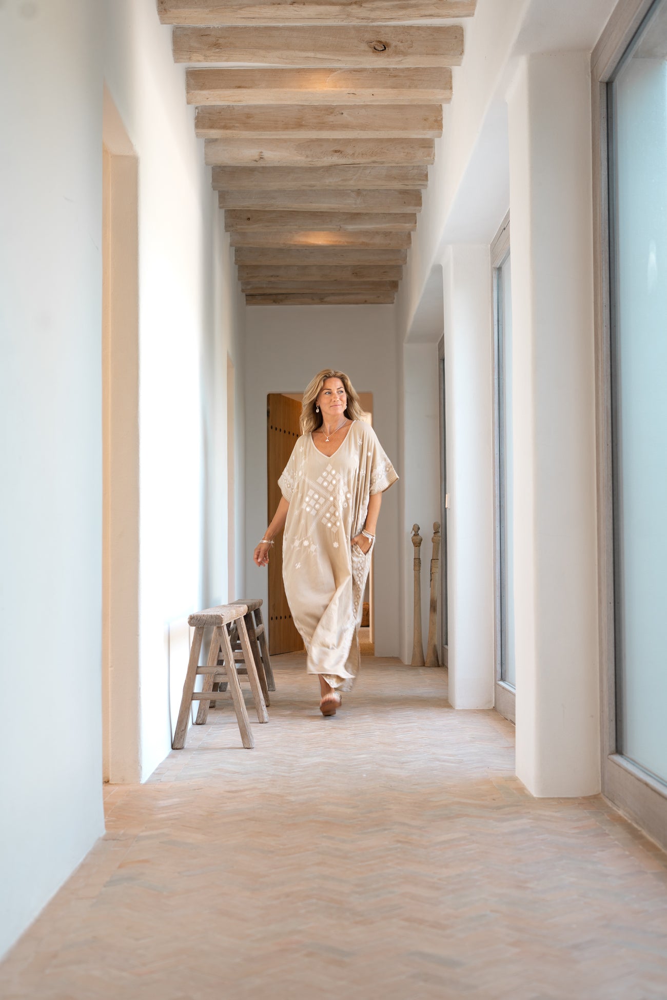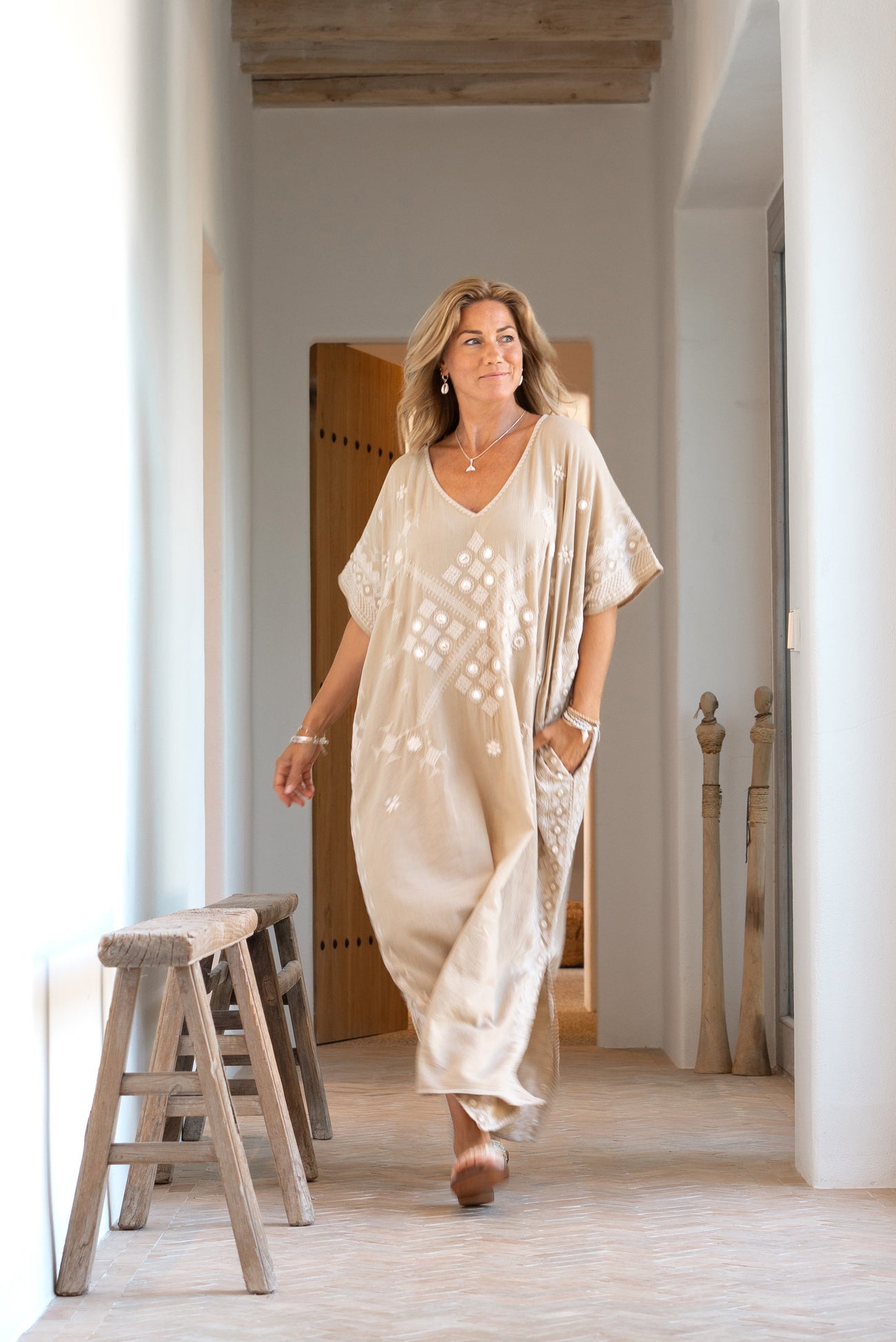 Después, transforma fácilmente el caftán en un look de noche. Cambia las sandalias por alpargatas de tacón y añade joyas doradas. Puedes ir de un club de playa a una cena al atardecer sin cambiarte. El largo añade elegancia a la luz del atardecer.