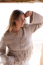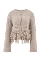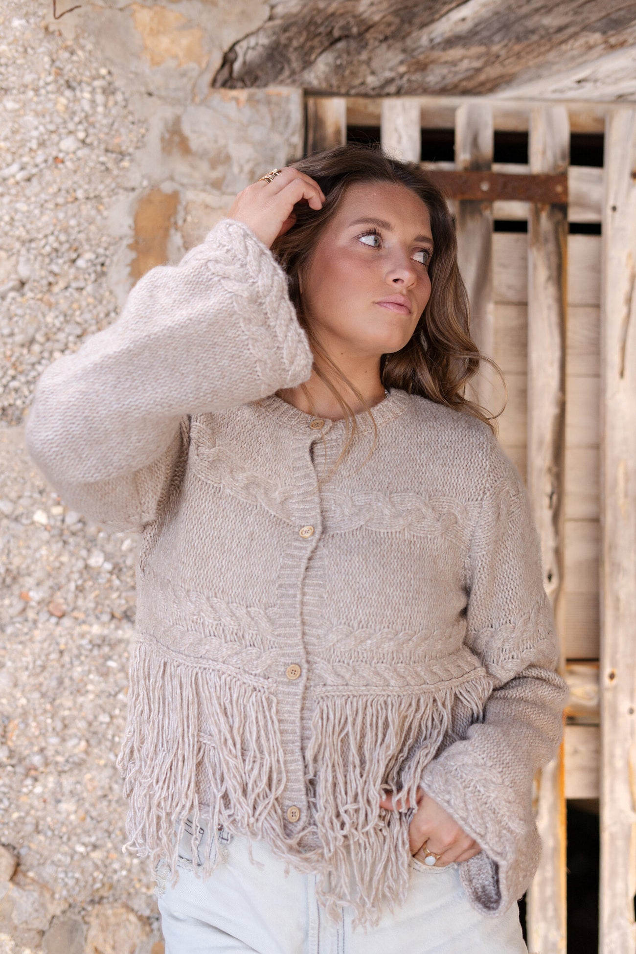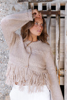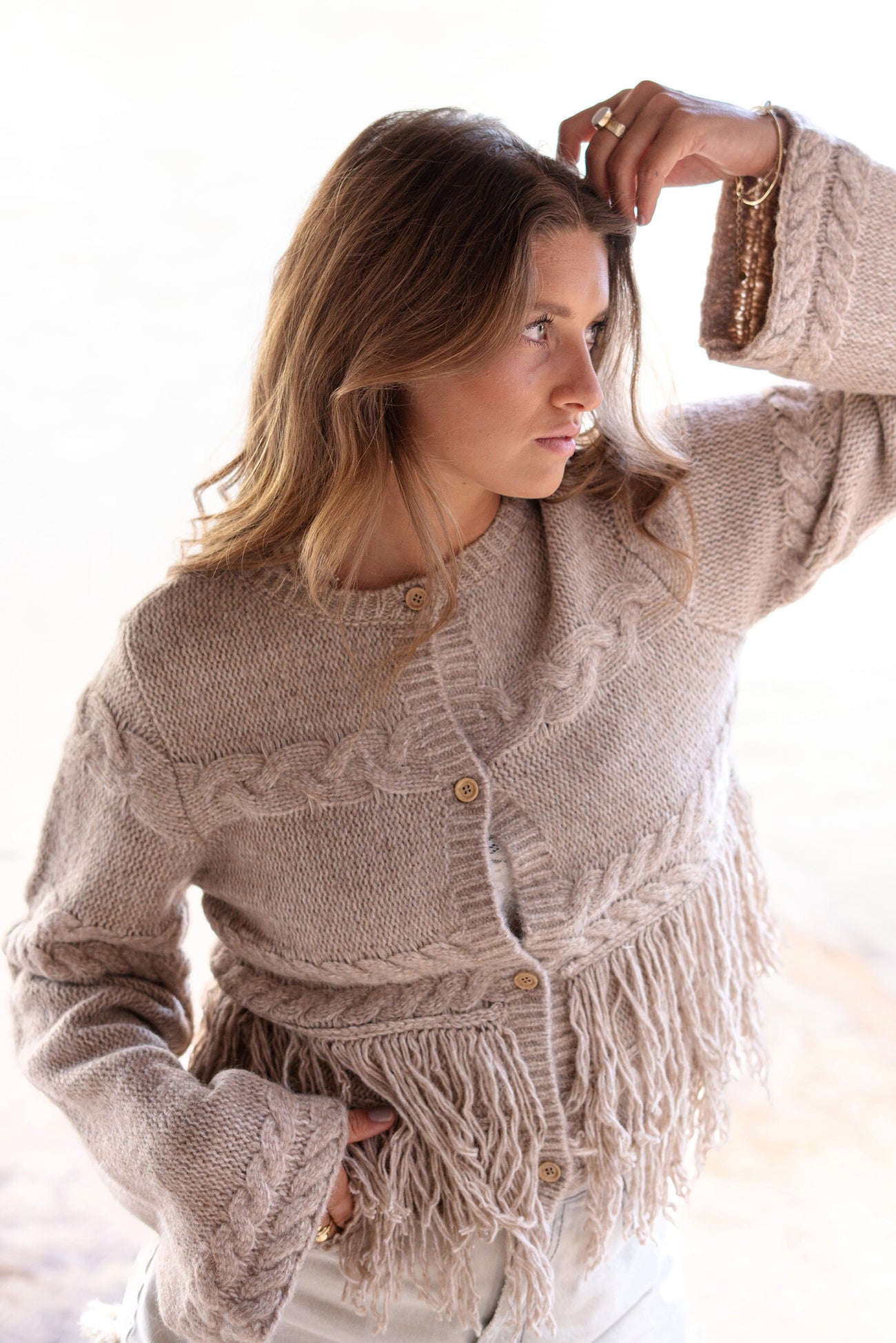 Con la Chaqueta de flecos Daira Taupe de ibZmode, estarás lista para cualquier escapada veraniega. Chaqueta de punto fino con flecos, se cierra con botones de madera Póntela con tus accesorios favoritos para un look con auténticas marcas de Ibiza. Que siga llegando el verano: estás preparada para él.