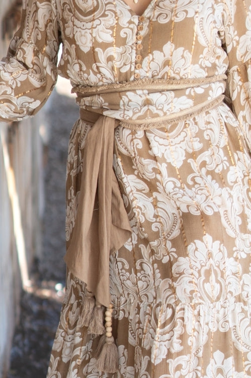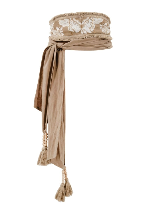 Este Cinturón Ese Barroco Topo Barroco de ibZmode en color topo desprende vibraciones ibicencas. Un cinturón ancho con estampado barroco, confeccionado en hilo de lúrex dorado El tejido vaporoso se siente suave en la piel. Compra ahora en ibizamode y presume de estilo este verano.
