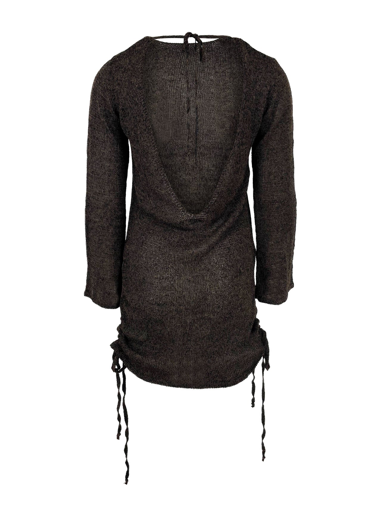 Este vestido de punto Yulia de MOOST Wanted en color topo oscuro respira vibraciones ibicencas. Tiene la espalda abierta, cordones en el cuello para anudarlo, manga acampanada, cordones para doblar el vestido aa Deja que llegue el verano: estás lista para él.