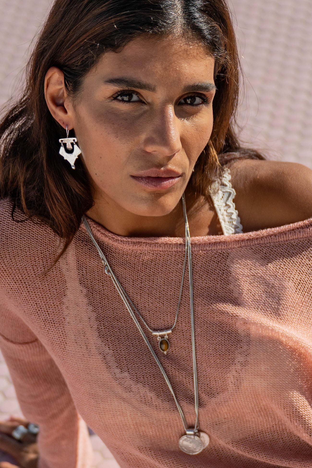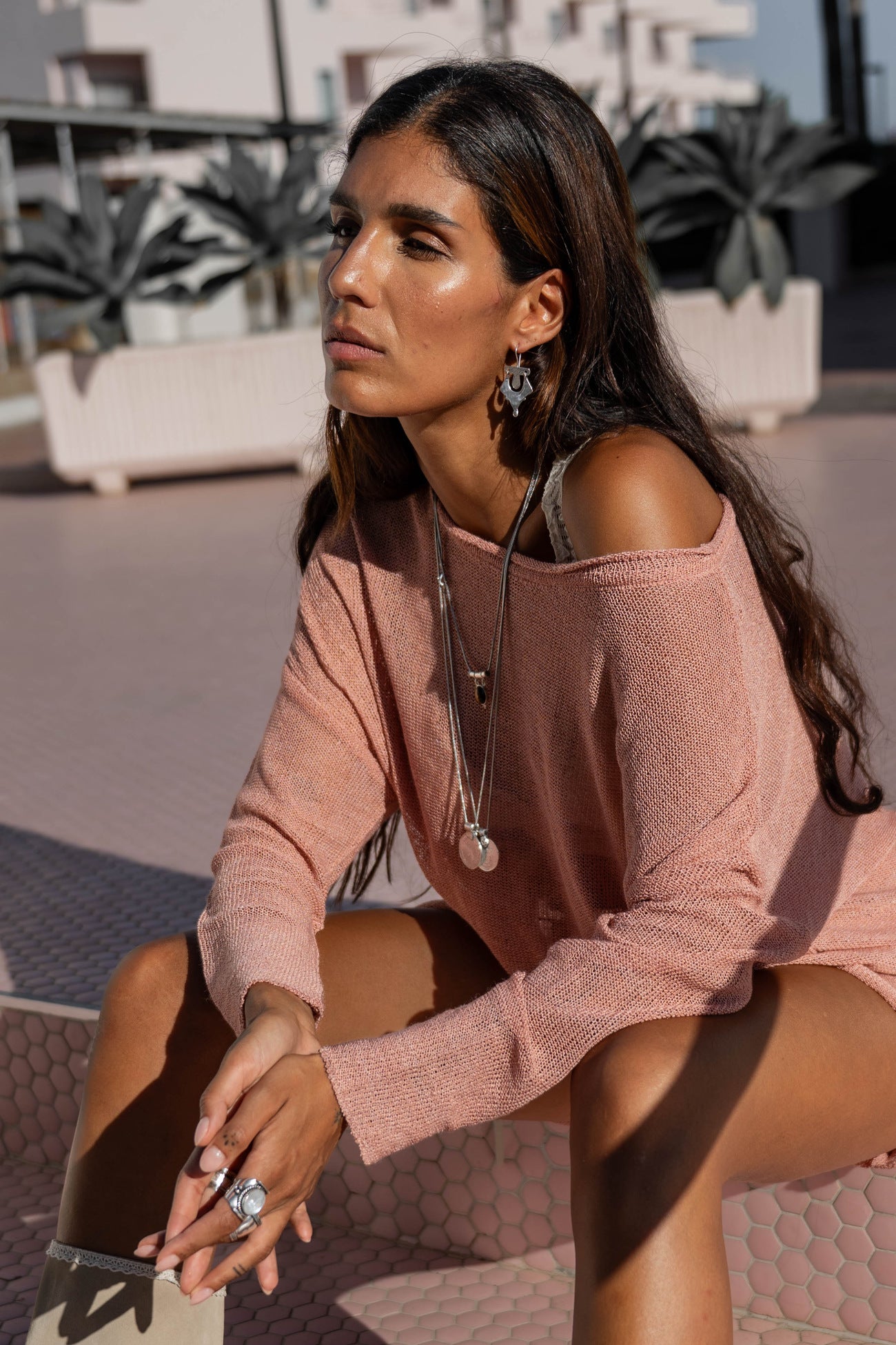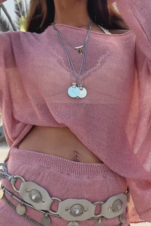 Tout d'abord, la structure en tricot se démarque. Les détails ajourés donnent un aspect subtilement transparent. Cela crée une tension sans être trop exposé. En même temps, le haut reste portable et équilibré. Ainsi, Milou correspond parfaitement à l'ambiance Destination Pink : audacieuse, bohème et confiante.