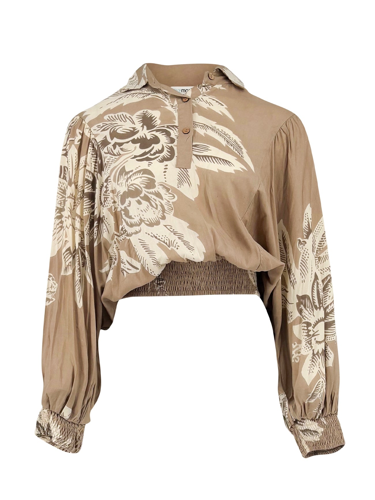 Product gegevens: Blouse met bloemendessin, kraagje en knoopjes, aan de polsen en de onderkant zit een brede elastische band