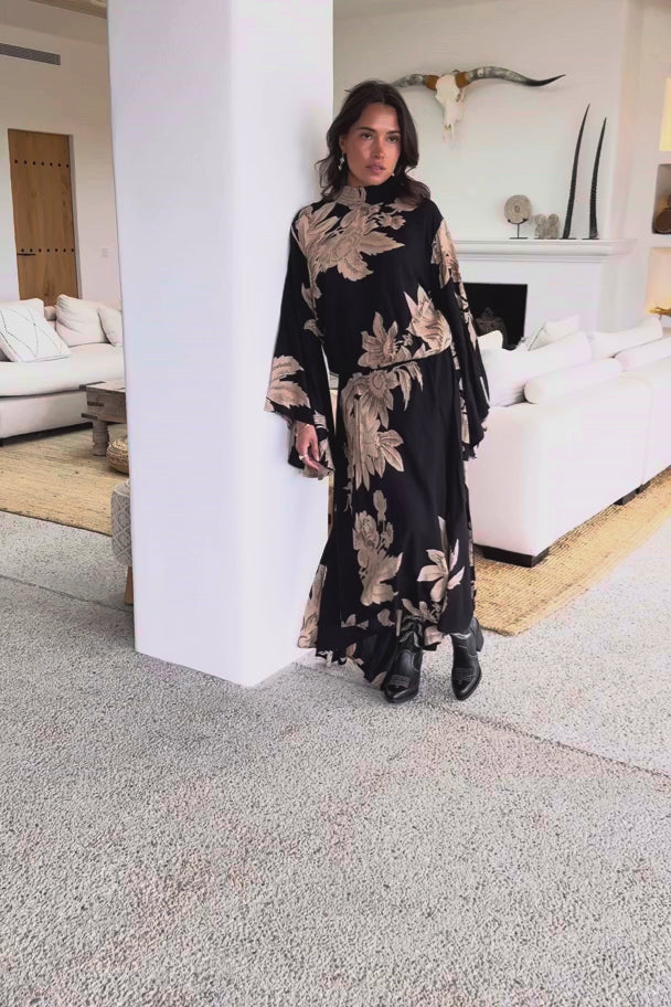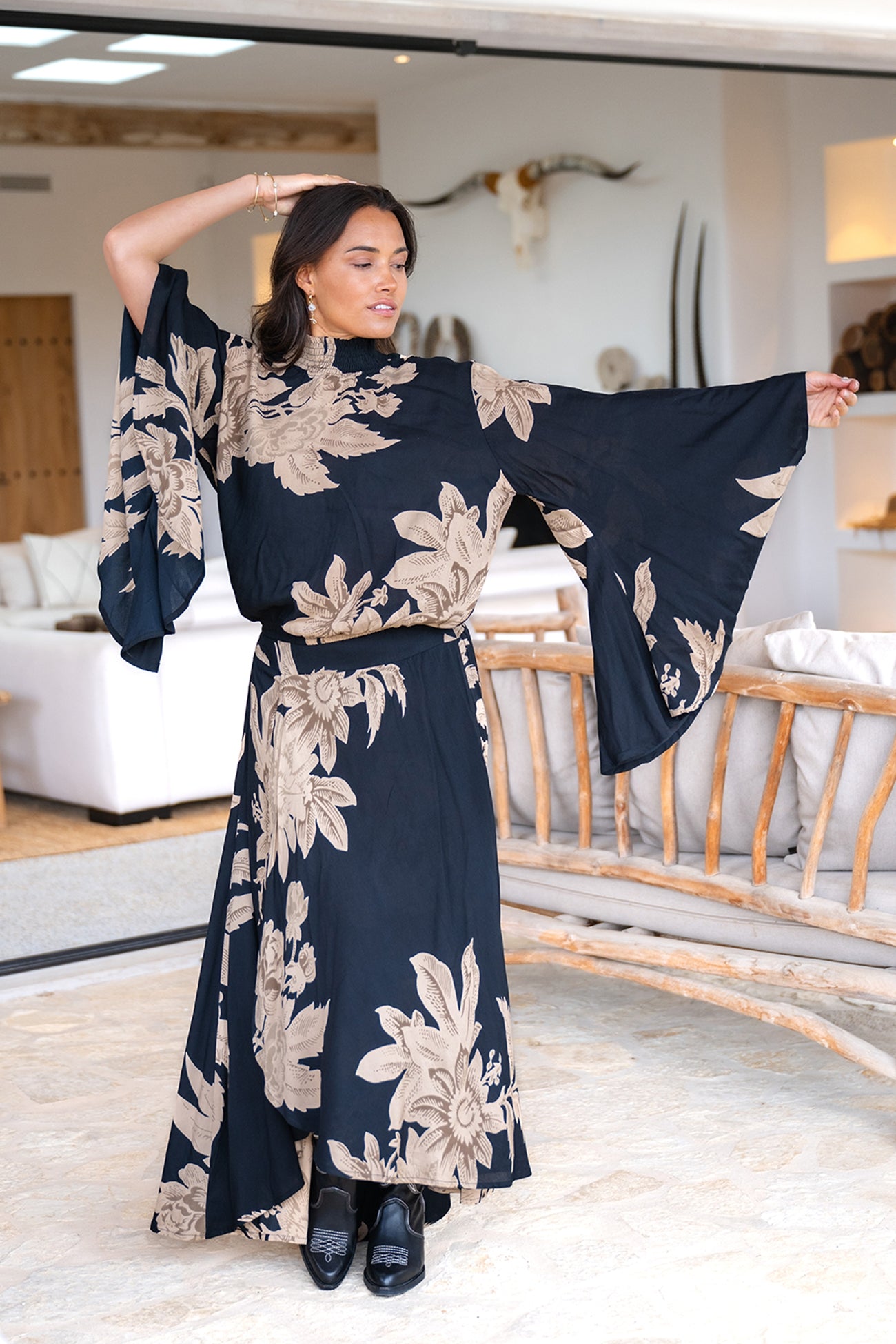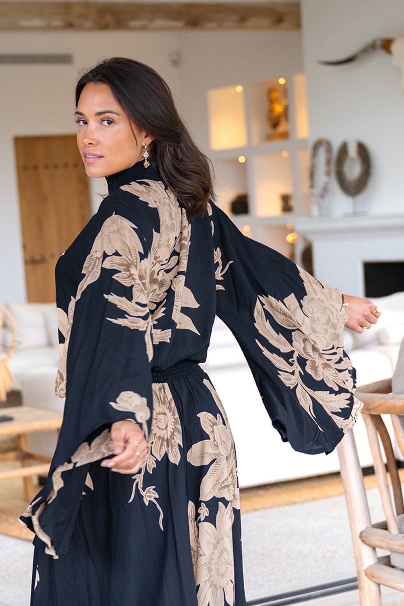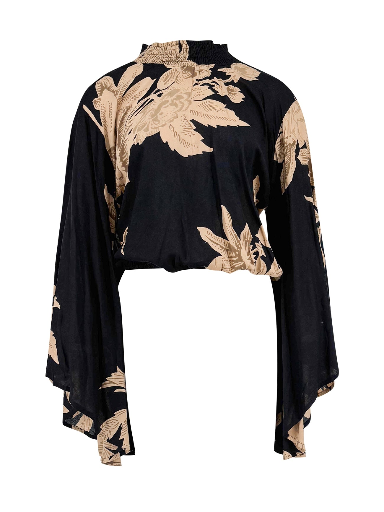 Product gegevens: Blouse met bloemendessin, hoge elastische hals en knoopjes in de nek, heeft flare mouwen en elastische band aan de onderkant