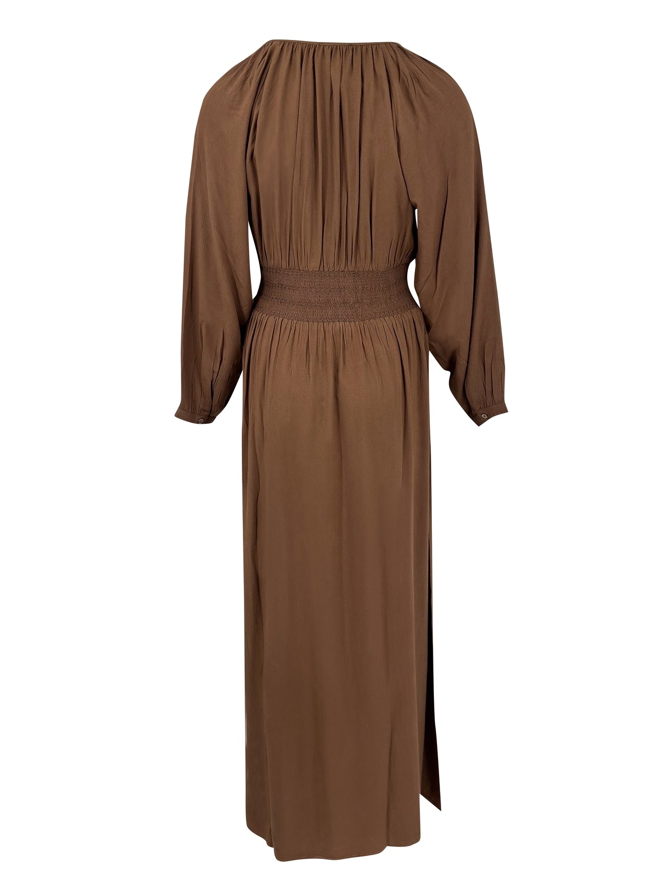 Product gegevens: Een lange jurk met split aan beiden zijden, een lage halslijn, detail werk aan de voorzijde