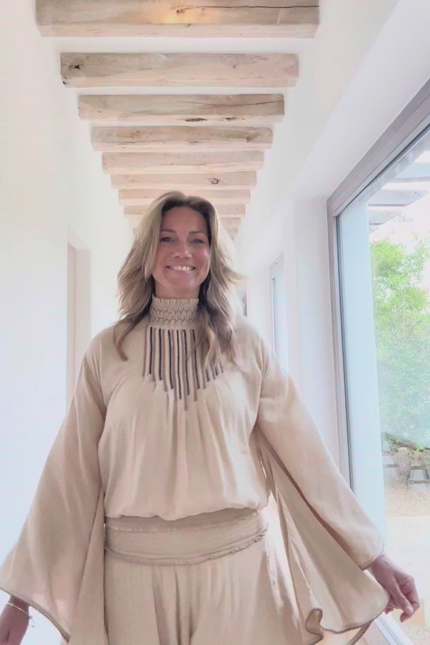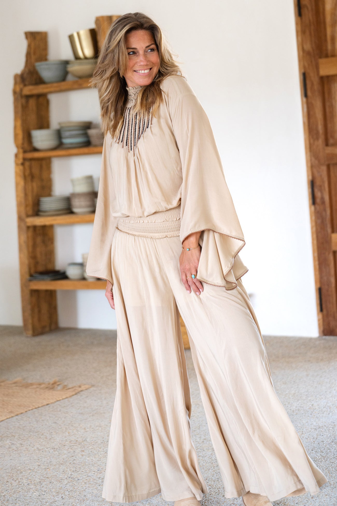 Product gegevens: Pantalon long et large, en tissu souple flutté, avec une large ceinture smockée avec élastique pour une portabilité fine.