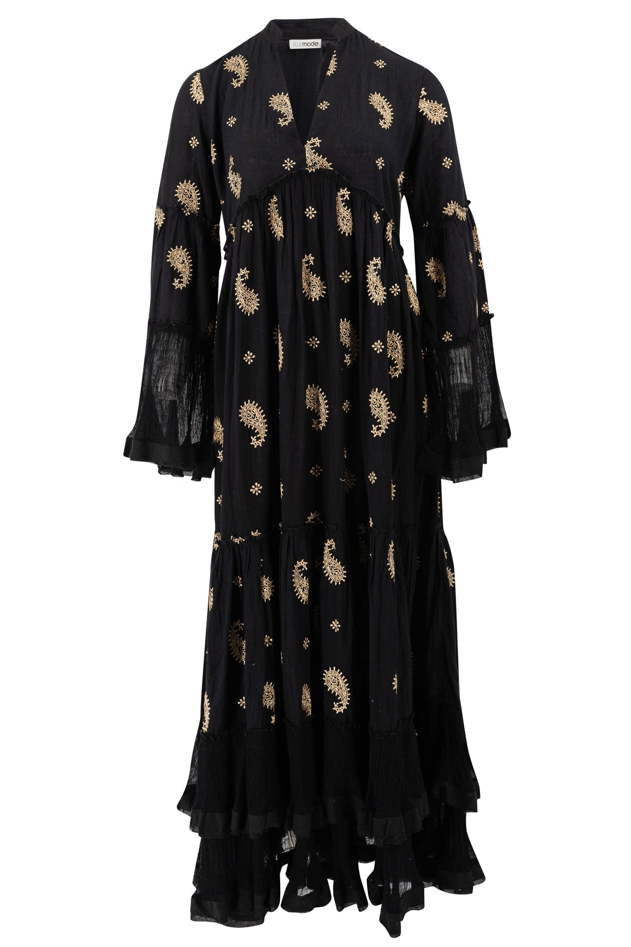 Avec la robe maxi Dali Esencia Black de ibzmode, tu seras prête pour toutes les escapades estivales. Possède une encolure en V et un col montant, des manches trompettes, s'évase à partir du buste, a hor Parfaite pour combiner avec des tongs, un top basique ou un chemisier léger. Commande rapidement et profite du style de vie bohème au quotidien.
