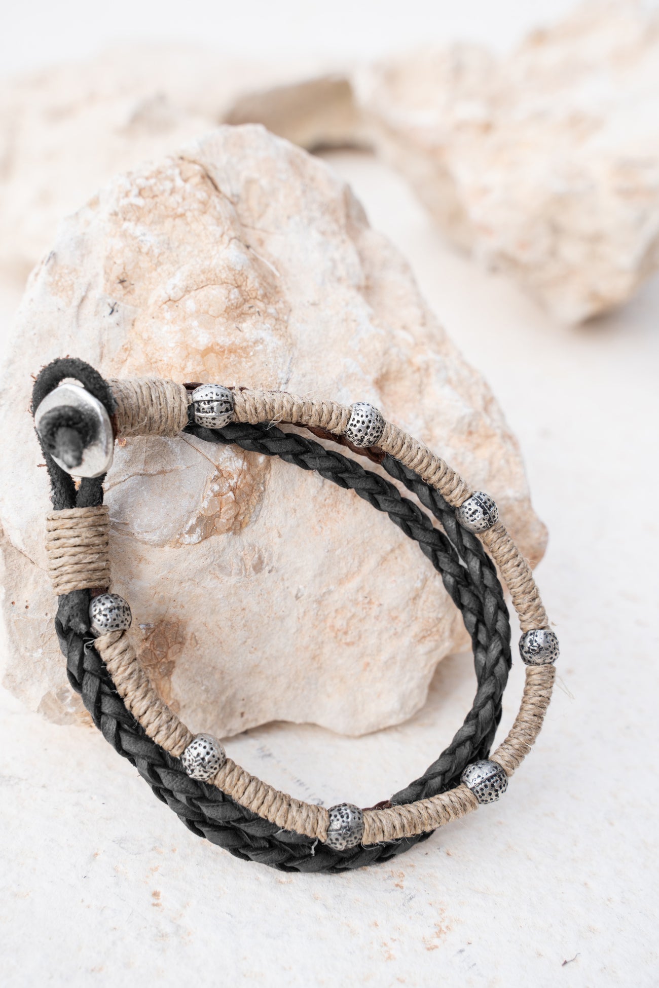 Product gegevens: Stoere armband gemaakt van Leer, Zink en Jute. Wordt geleverd in een mooie jute verpakking. Draag dit bij voorkeur niet in water of onder de douche!