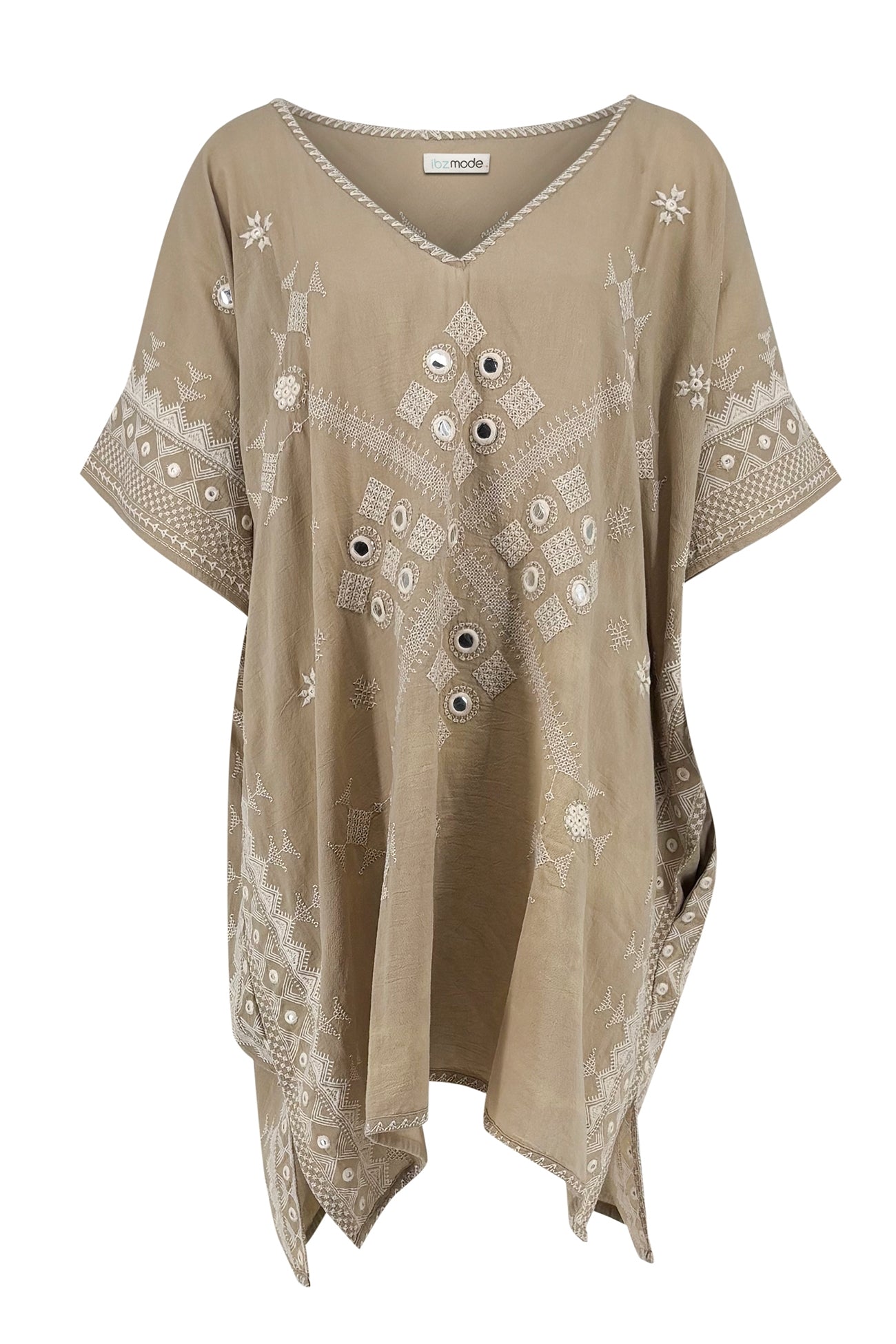 Ten eerste vallen de handgemaakte details op. Rijk borduurwerk en zorgvuldig geplaatste spiegeltjes vangen het zonlicht subtiel. Bij elke beweging ontstaat een zachte glans. Daardoor is Luxe Kaftan Hilla Sundara Light Taupe gemaakt om gezien te worden. Ideaal voor beachclubs, lange lunches en momenten waarop stijl vanzelfsprekend voelt.