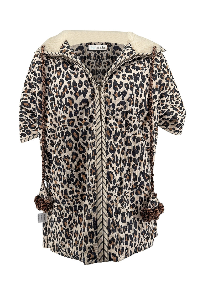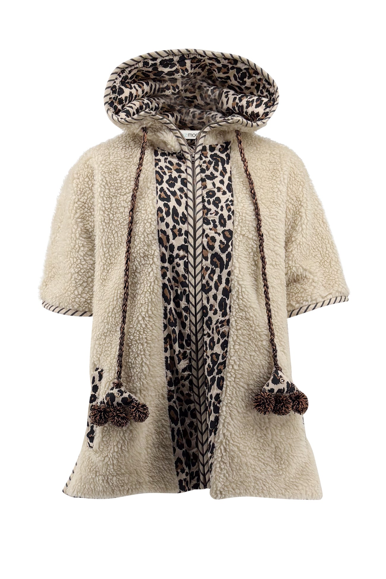 Product gegevens: Omkeerbare jas met korte mouwen en capuchon. Ene kant van de jas is teddy stof, de andere kant een print. Met ritssluiting