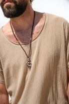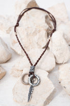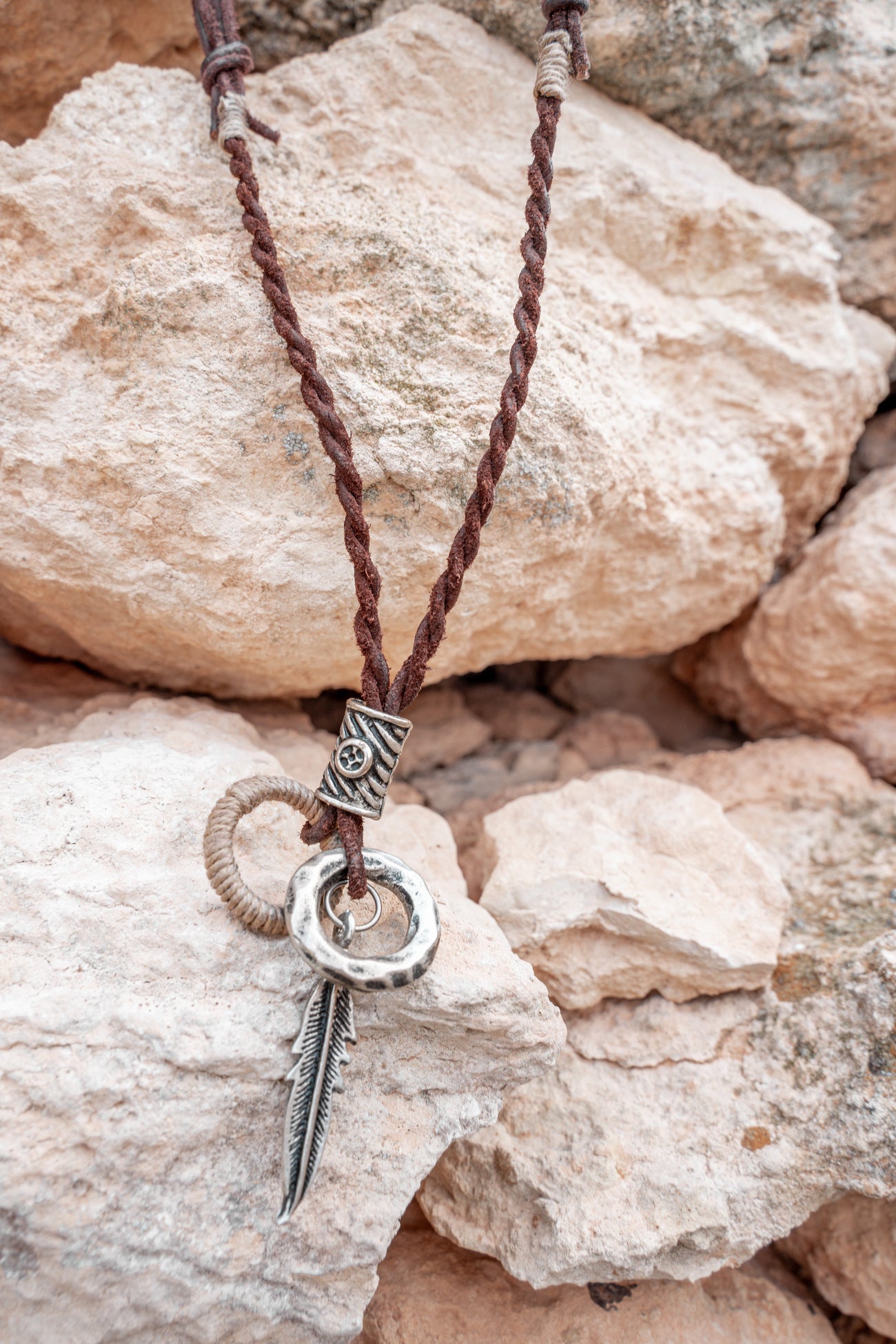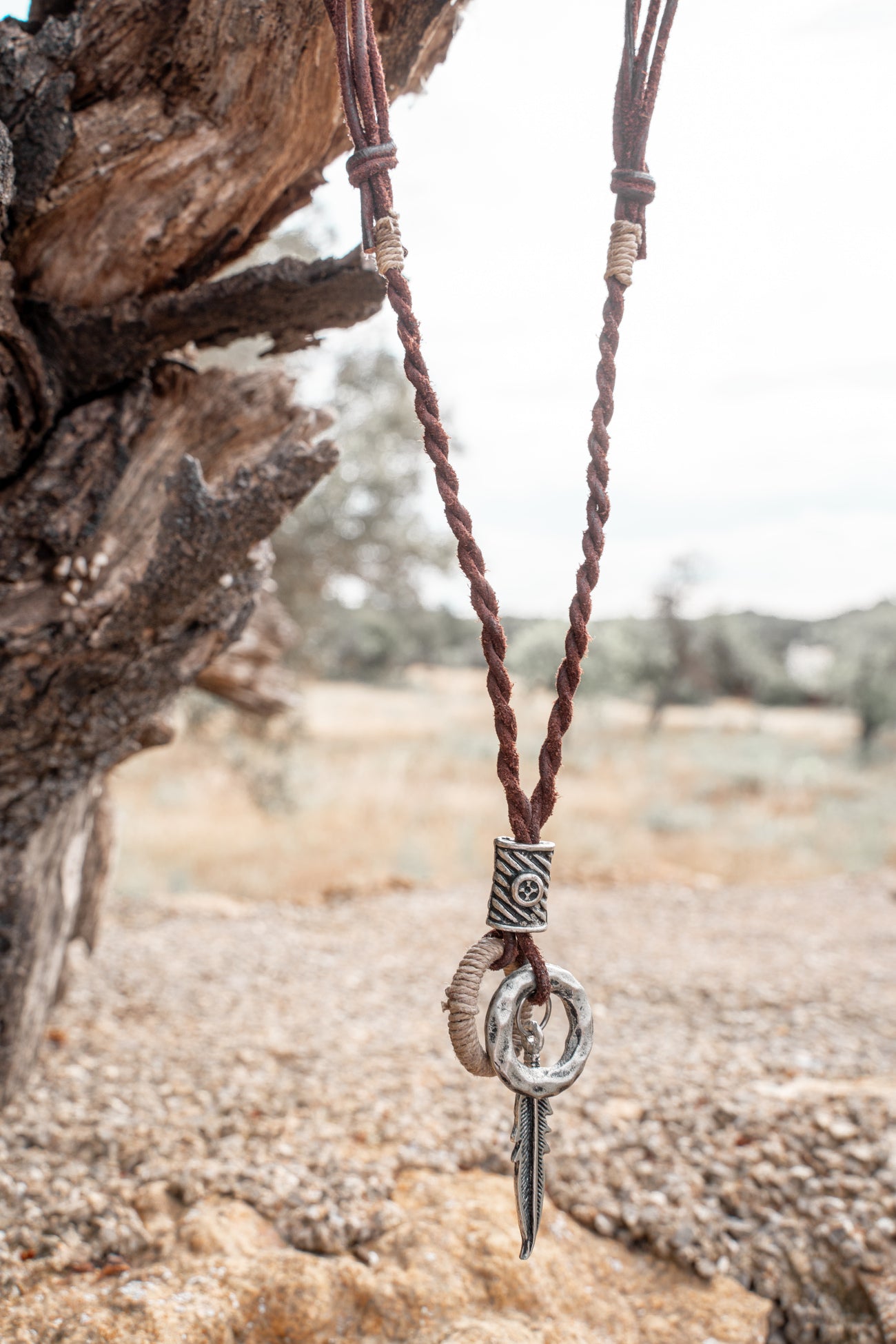 Product gegevens: Verstelbare ketting gemaakt van Leer, Zink en Jute. Wordt geleverd in een mooie jute verpakking. Draag dit bij voorkeur niet in water of onder de douche!