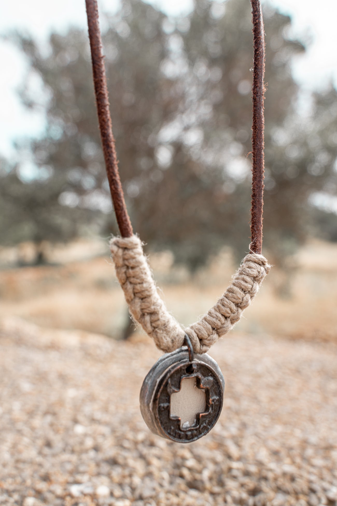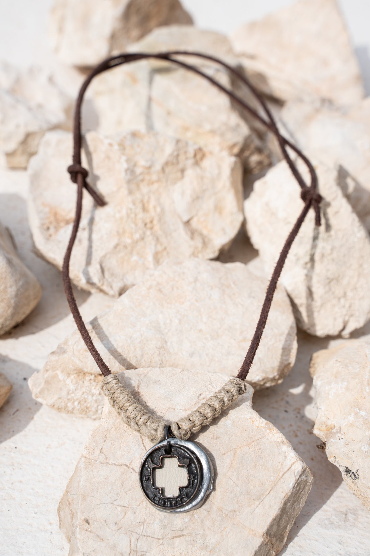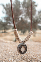 Product gegevens: Verstelbare ketting gemaakt van Leer, Zink en Jute. Wordt geleverd in een mooie jute verpakking. Draag dit bij voorkeur niet in water of onder de douche!