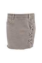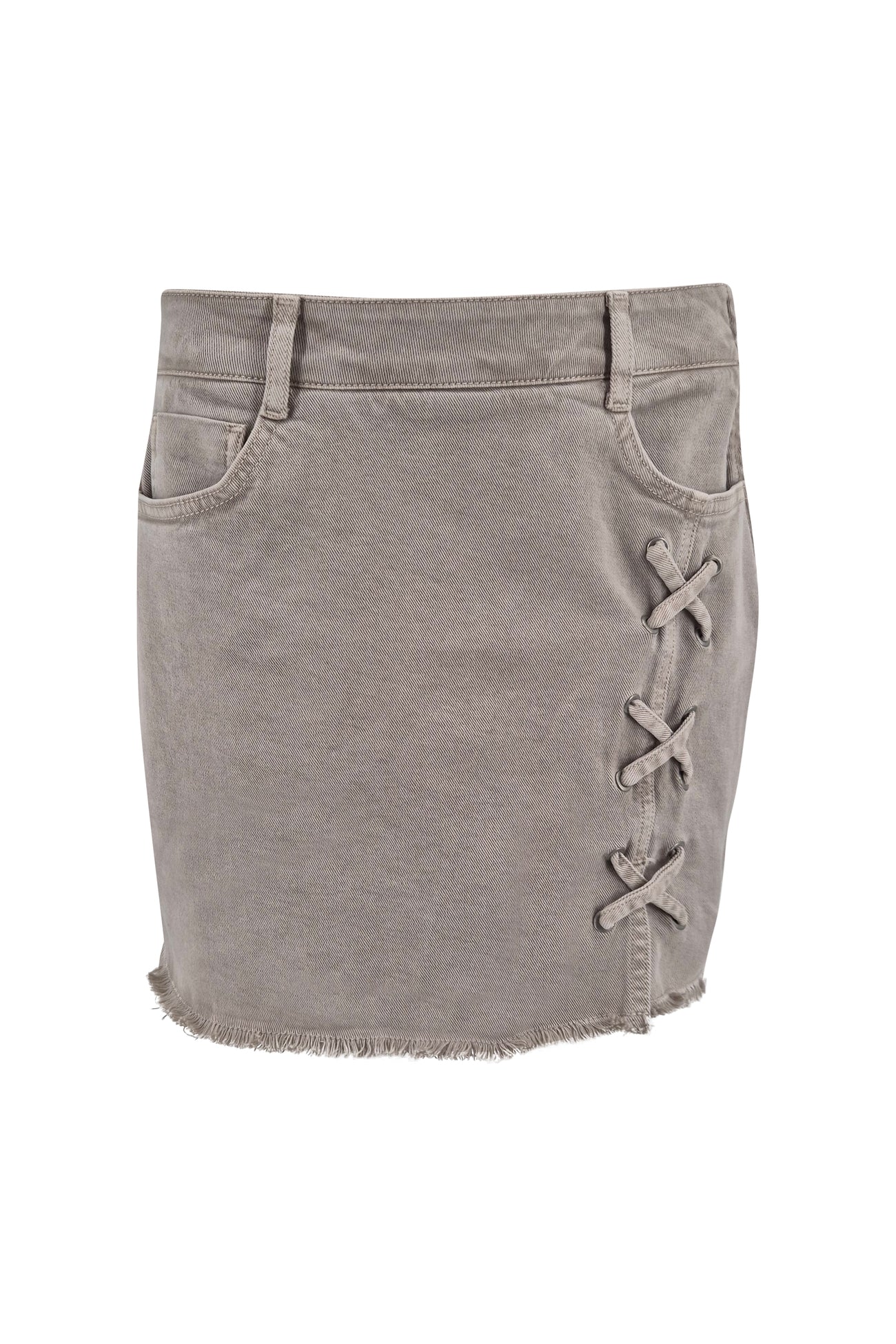 Product gegevens: Korte rok van licht stretchende spijkerstof met rijgdetail aan een zijkant en gerafelde zoom aan de onderkant
