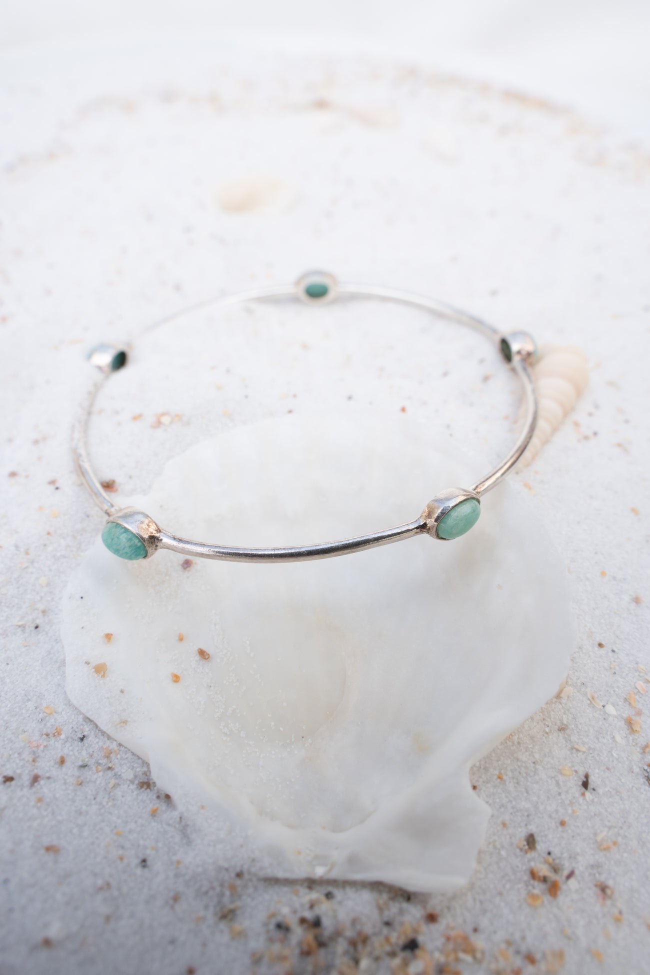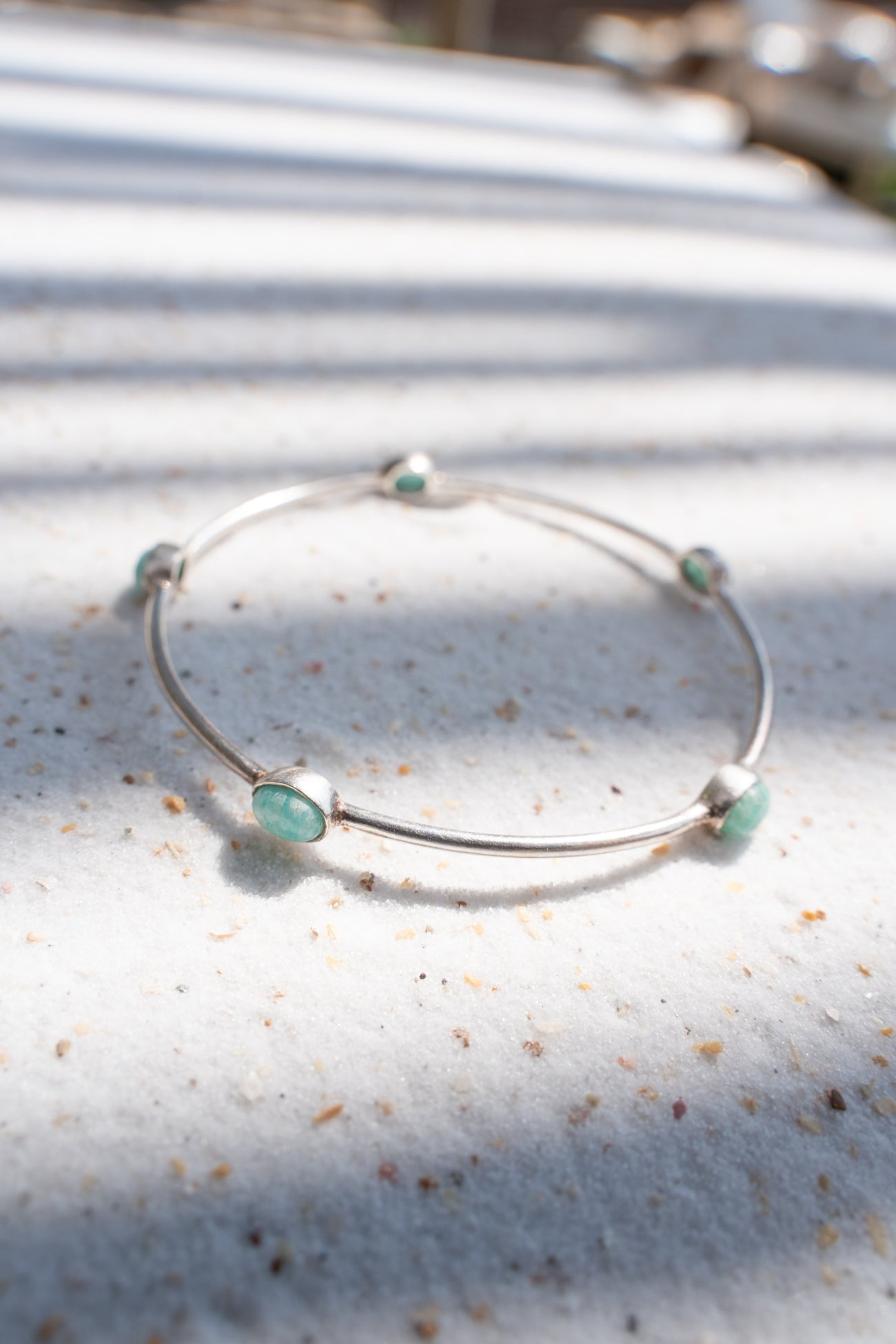 Pasvorm: Brass silver plated armband, heeft turquoise amazonite dots, heeft geen sluiting