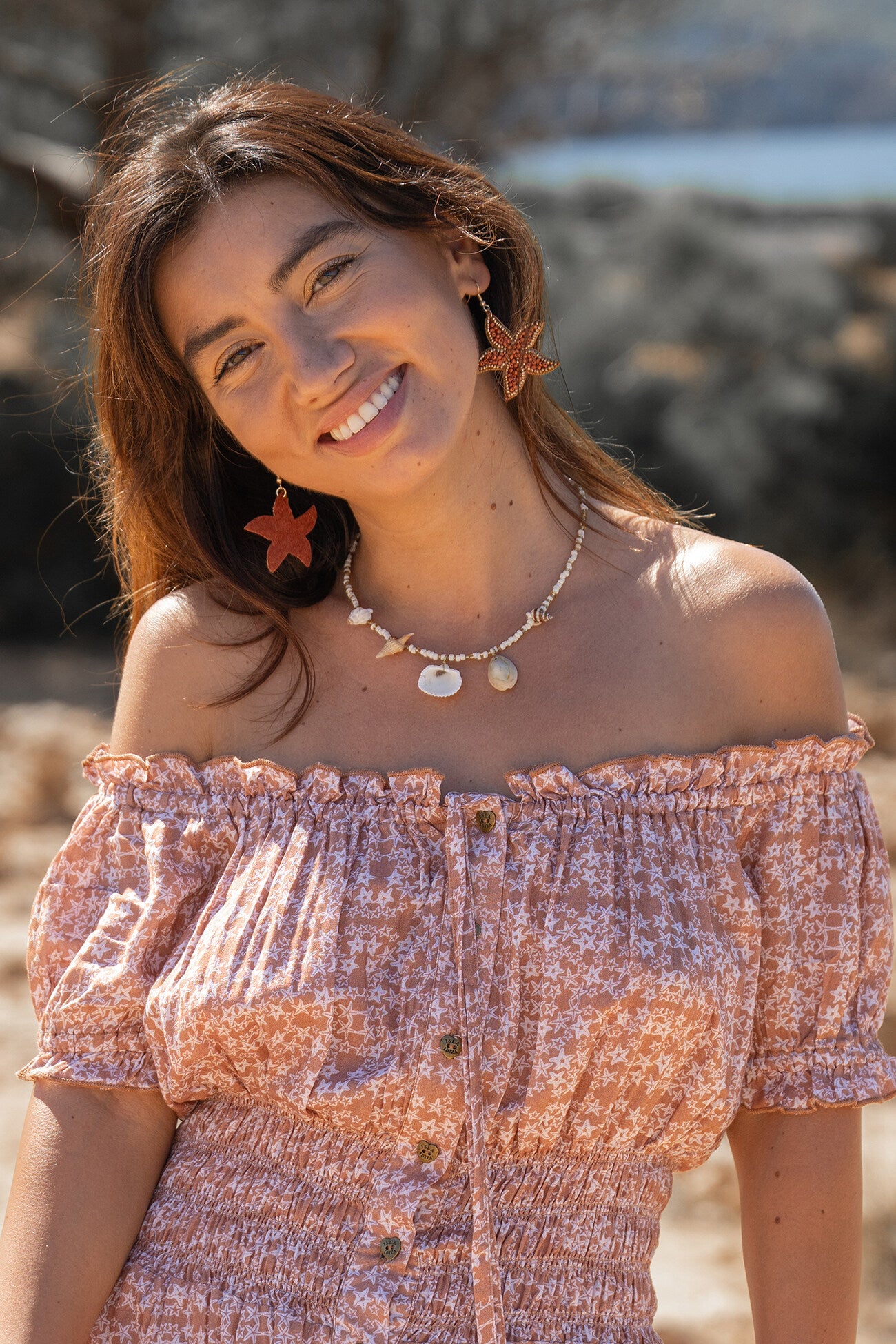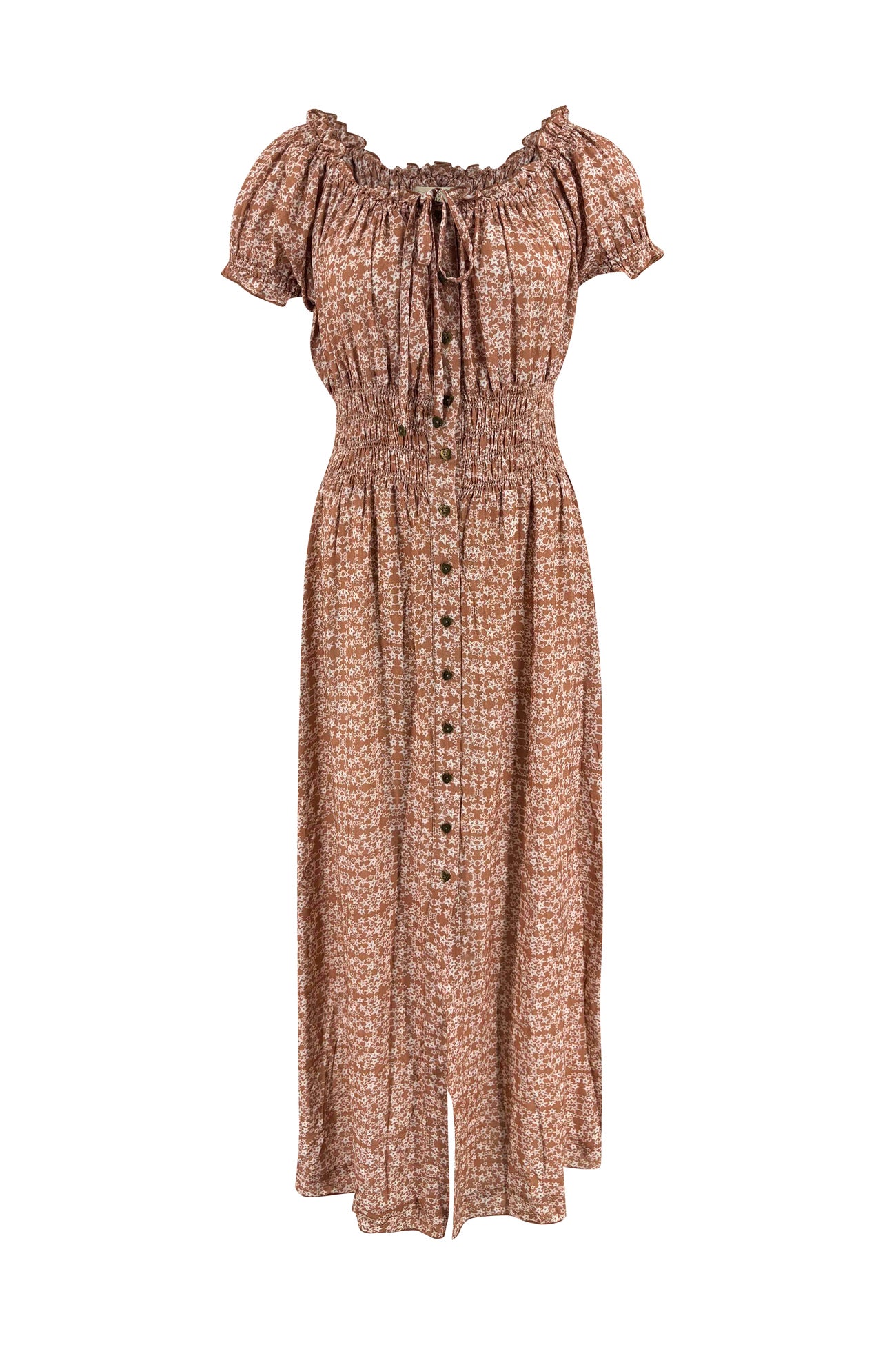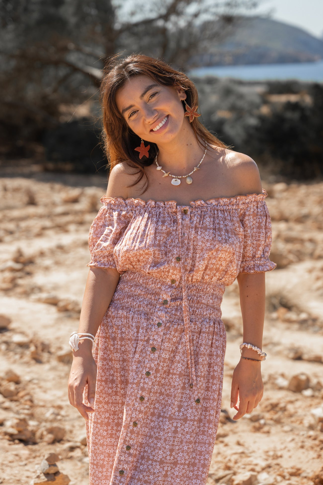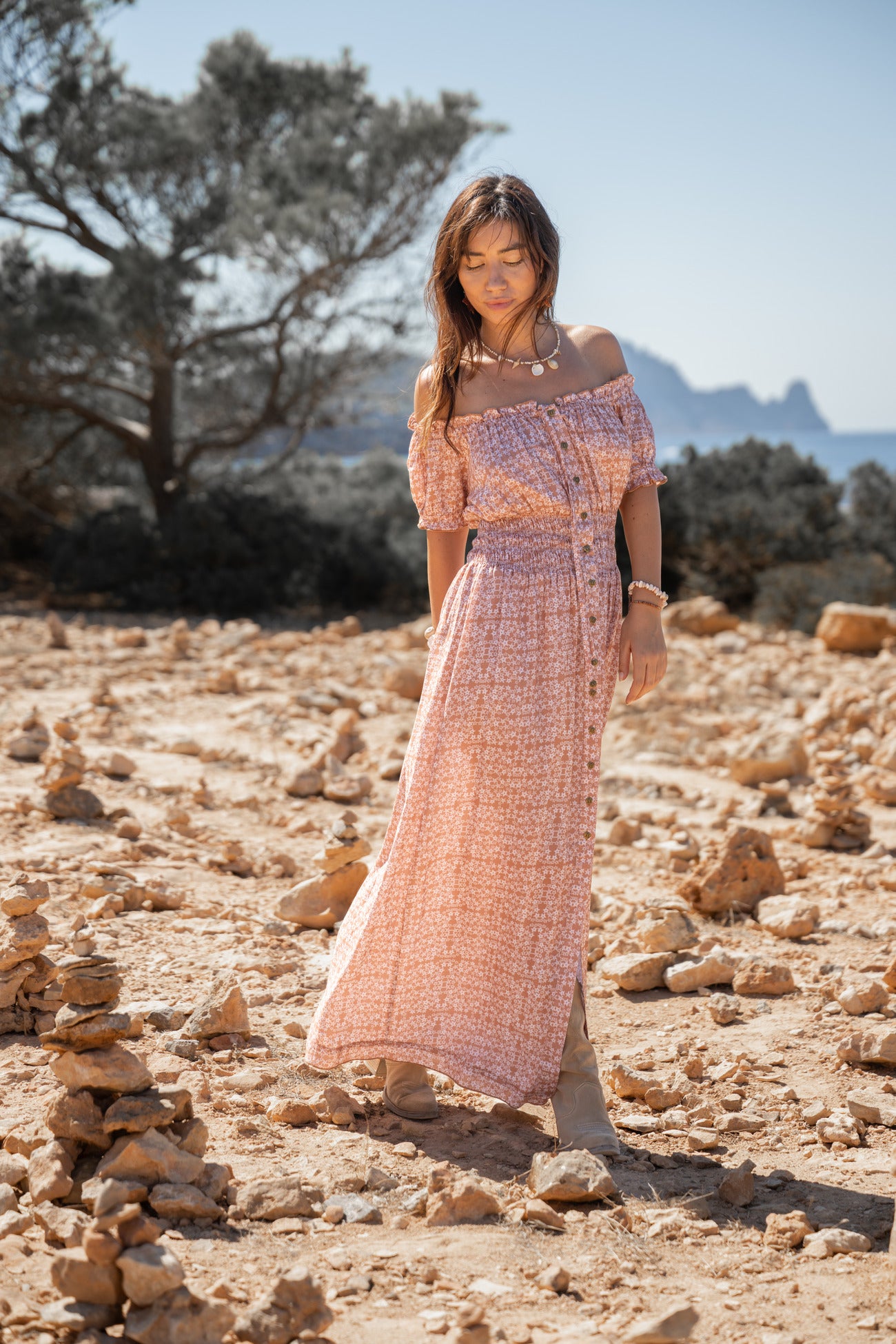 Deze lange zomerjurk heeft een elegante, aangesloten pasvorm bij het bovenlichaam dankzij de subtiele smockdetails en de knoopsluiting aan de voorkant. De off-shoulder halslijn met korte mouwtjes zorgt voor een vrouwelijke, speelse look en benadrukt op een zachte manier de schouders. De lange rok valt soepel naar beneden en beweegt luchtig mee bij iedere stap.