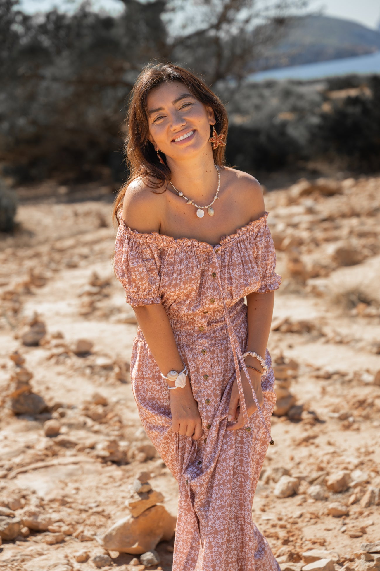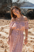 De Long Sun Dress Estrella van Isla Ibiza Bonita is een romantische lange zomerjurk met een zachte, zonnige uitstraling. De lichte print en warme tinten geven deze jurk een natuurlijke Ibiza vibe, perfect voor lange dagen in de zon.