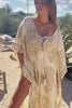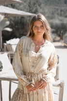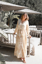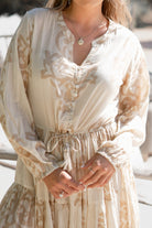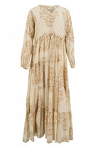 Product gegevens: Maxi jurk met knoopjes, loopt wijd uit, heeft een ronde hals, elastiek bij de polsen en boho print