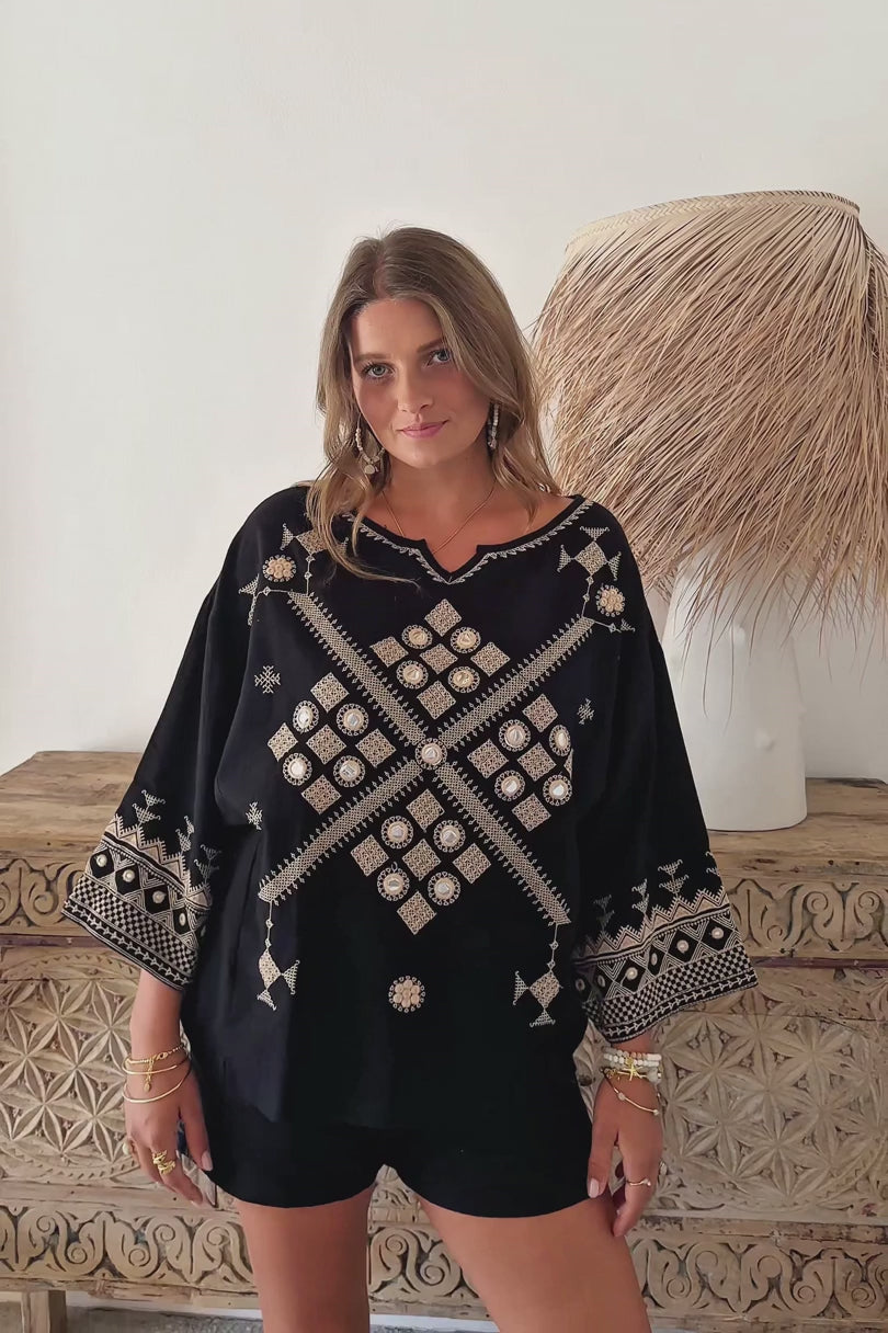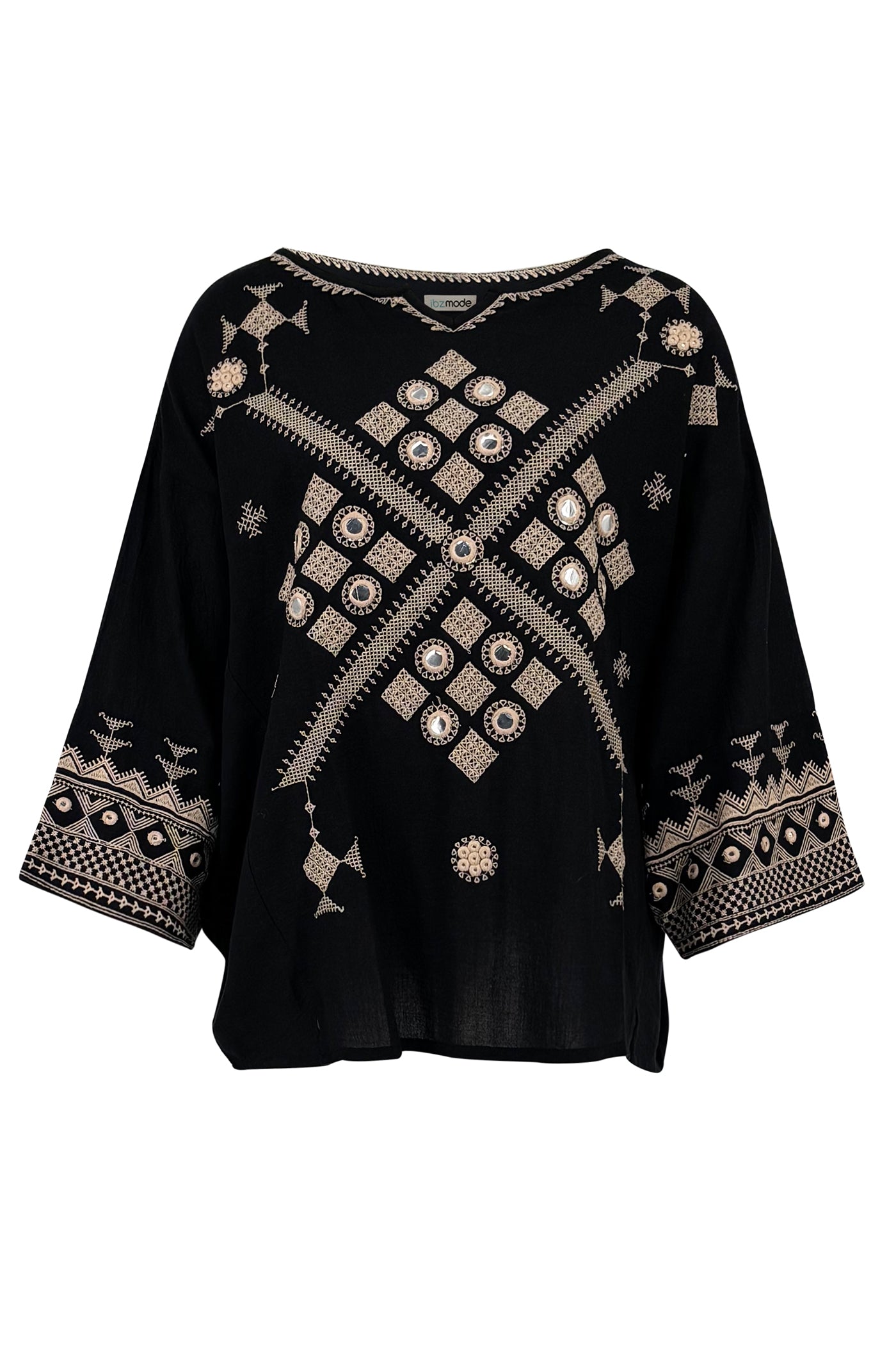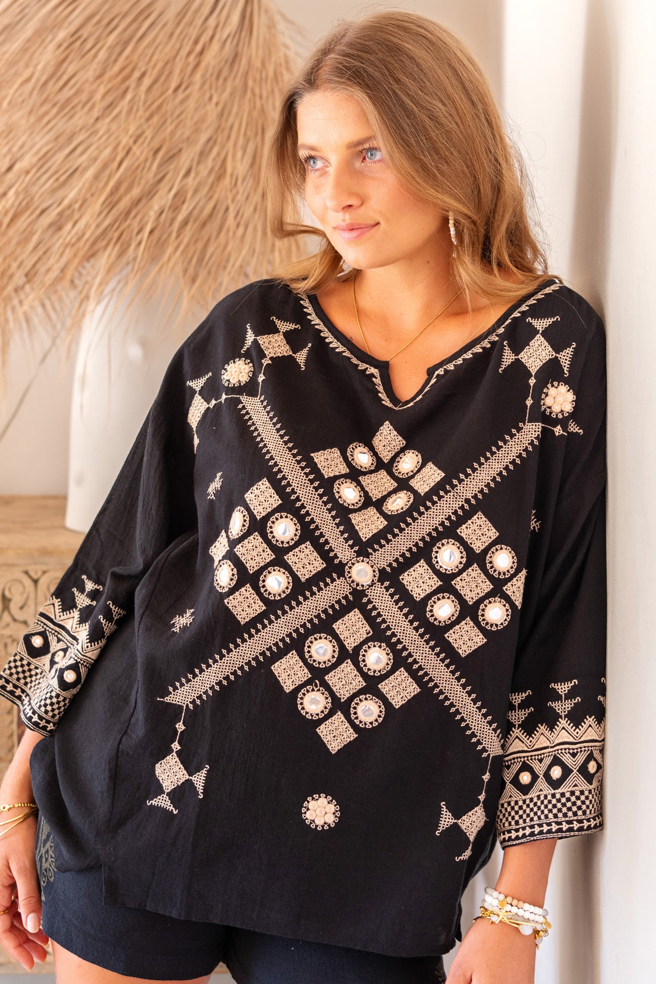 Ten eerste vallen de rijke borduursels en handgezette spiegeltjes op. Elk detail vangt het licht bij elke stap. Daardoor straalt Top Naluna Sundara Black aan de beachbar, tijdens lunch of sunset drinks. Het silhouet is relaxed, maar oogt altijd verzorgd en chic.